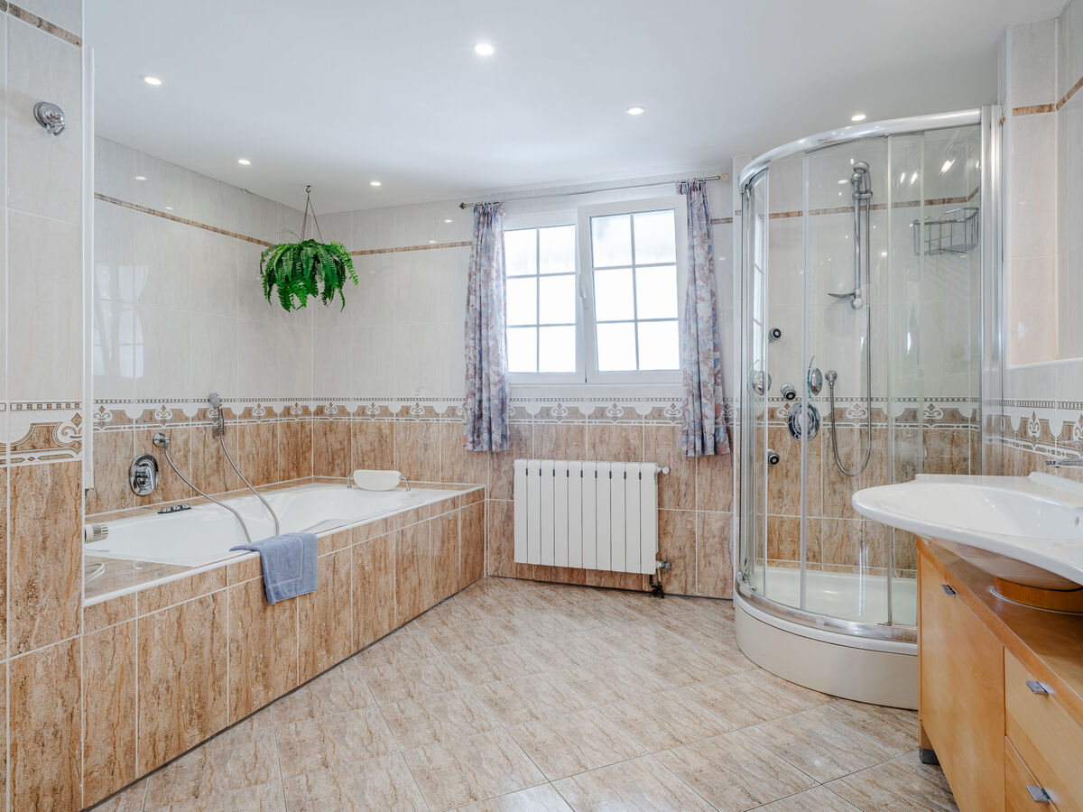 A usage privé: terrain 847 m2 (clôturé) avec plantes et arbres, piscine en forme d’haricot (8 x 4 m, disponibilité saisonnière: 01.Jun.