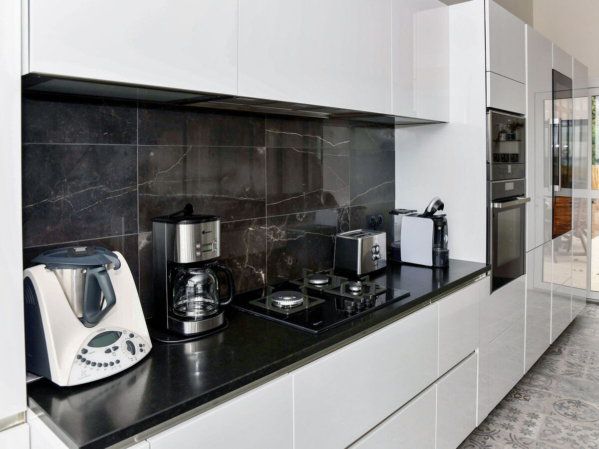 Cuisine (four, lave-vaisselle, 3 feux, micro-ondes, congélateur, cafetière électrique) avec petite table pour les repas.