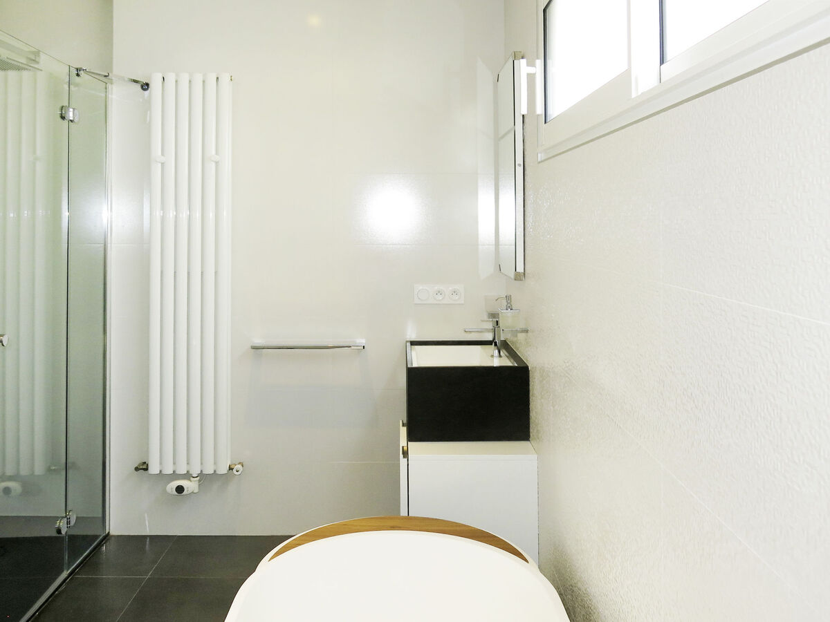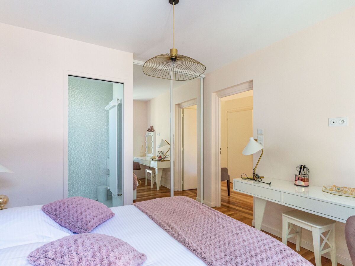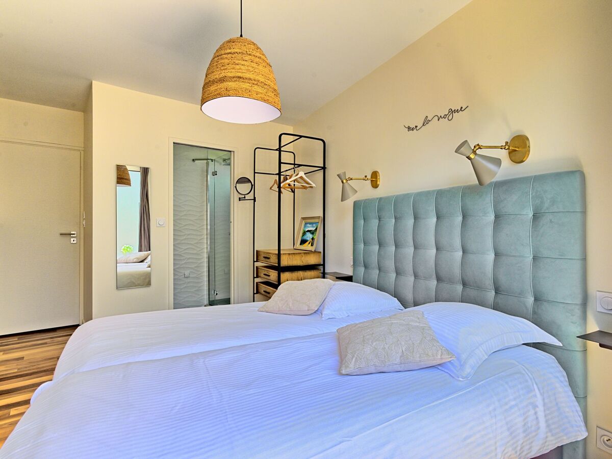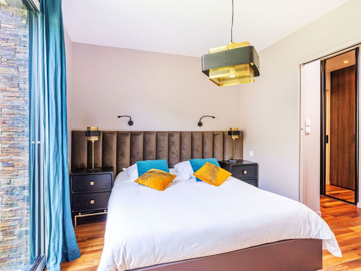 1 chambre avec 1 grand-lit (160 cm, longueur 200 cm), bain/douche et double vasque.