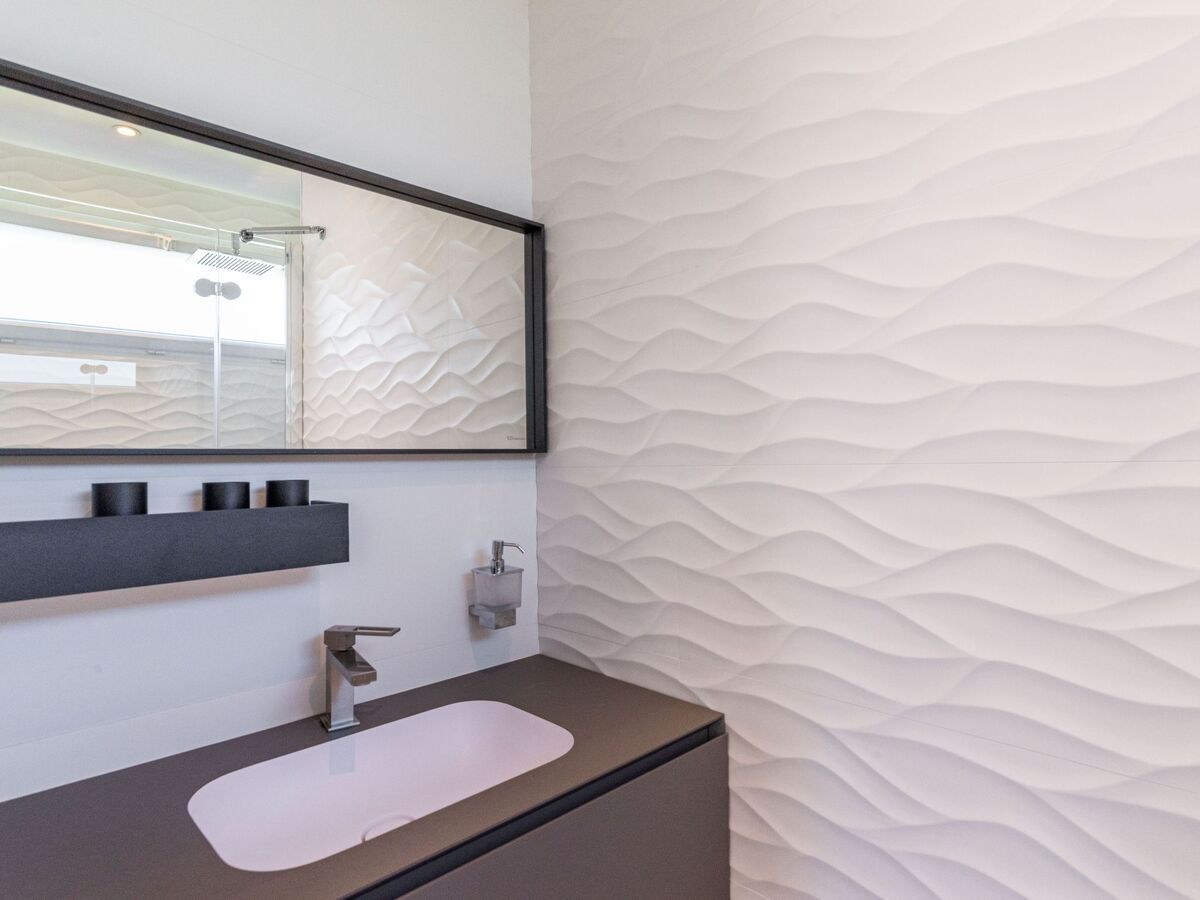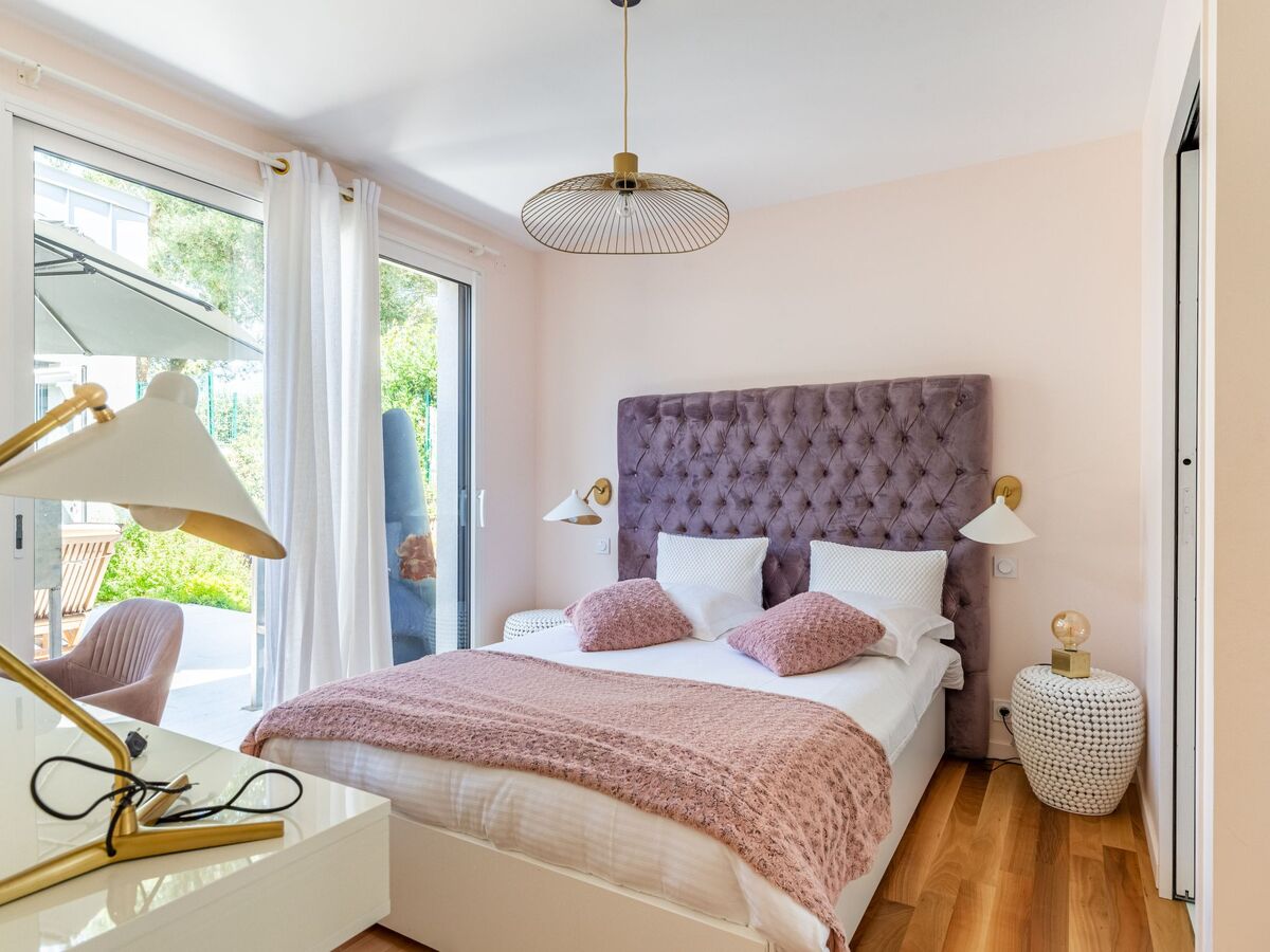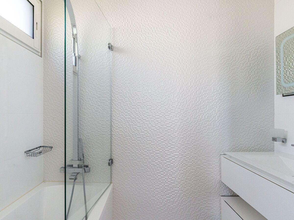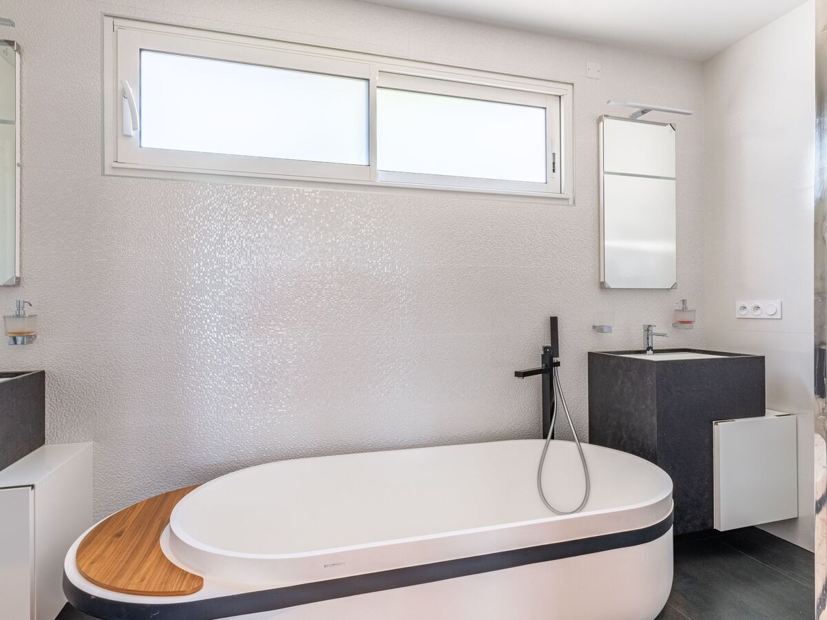 1 chambre avec 1 grand-lit (160 cm, longueur 200 cm), bain/douche et double vasque.
