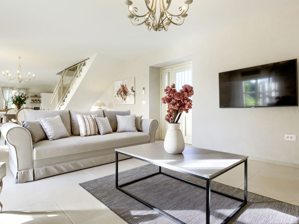 Rénovée en 2019: séjour/salle à manger avec cheminée et TV (satellite) (écran plat), chaîne stéréo et air-conditionné.