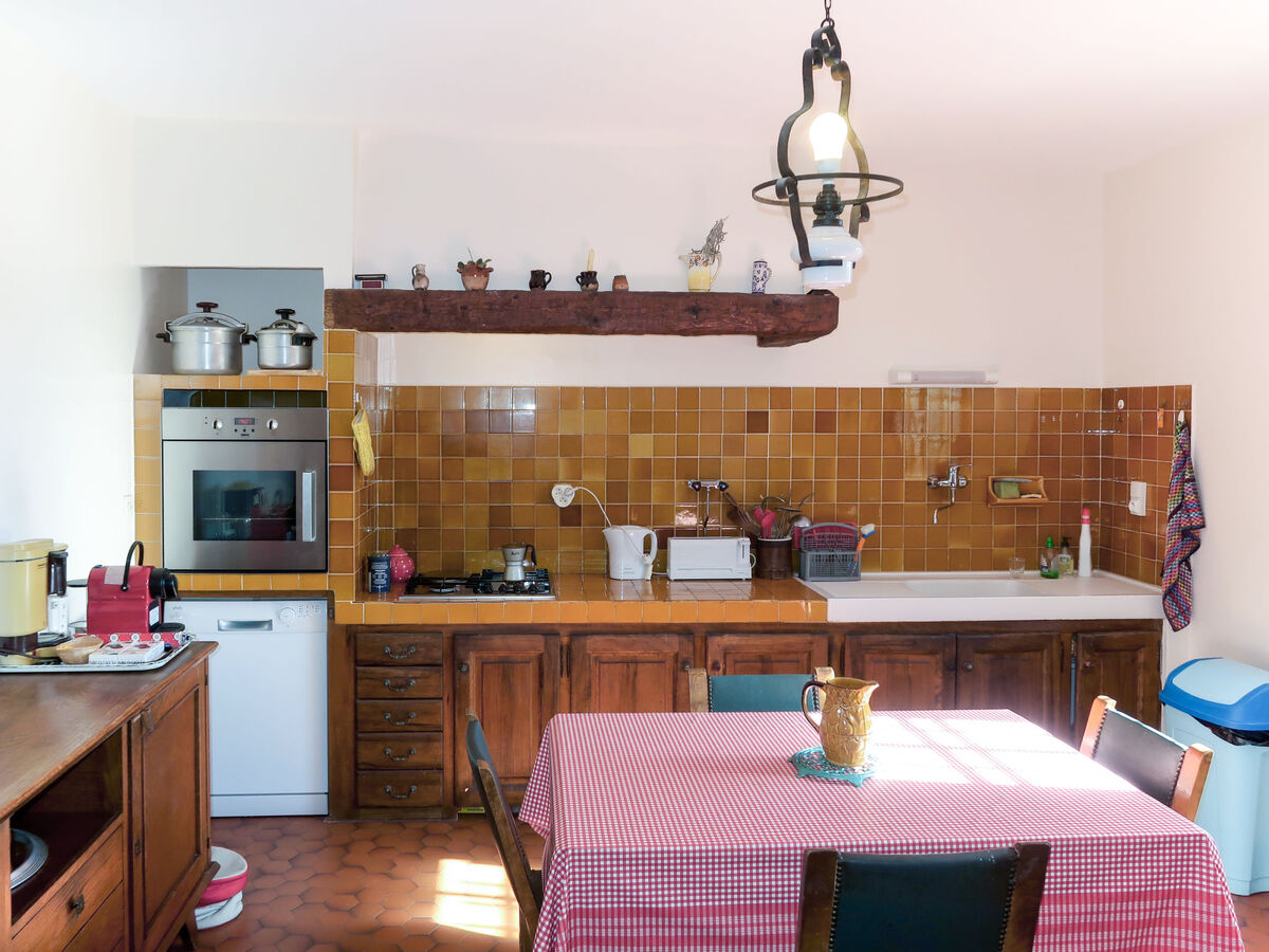 Cuisine (1 plaque de cuisson, four, lave-vaisselle, 3 feux, grille-pain, bouilloire électrique, micro-ondes, congélateur, cafetière électrique) avec petite table pour les repas.