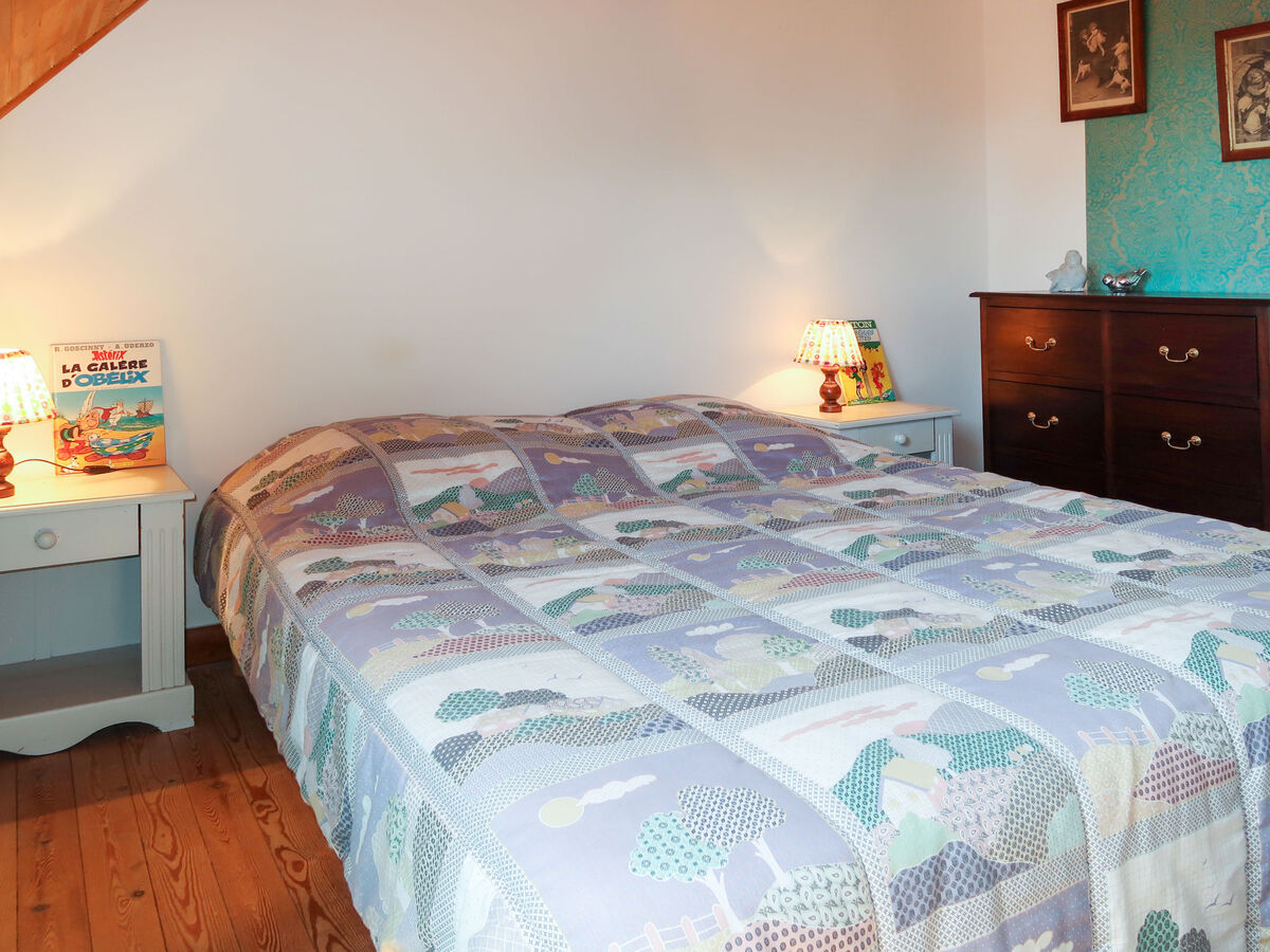 À l'étage supérieur: 1 chambre, mansardée avec 1 grand-lit (160 cm, longueur 200 cm).
