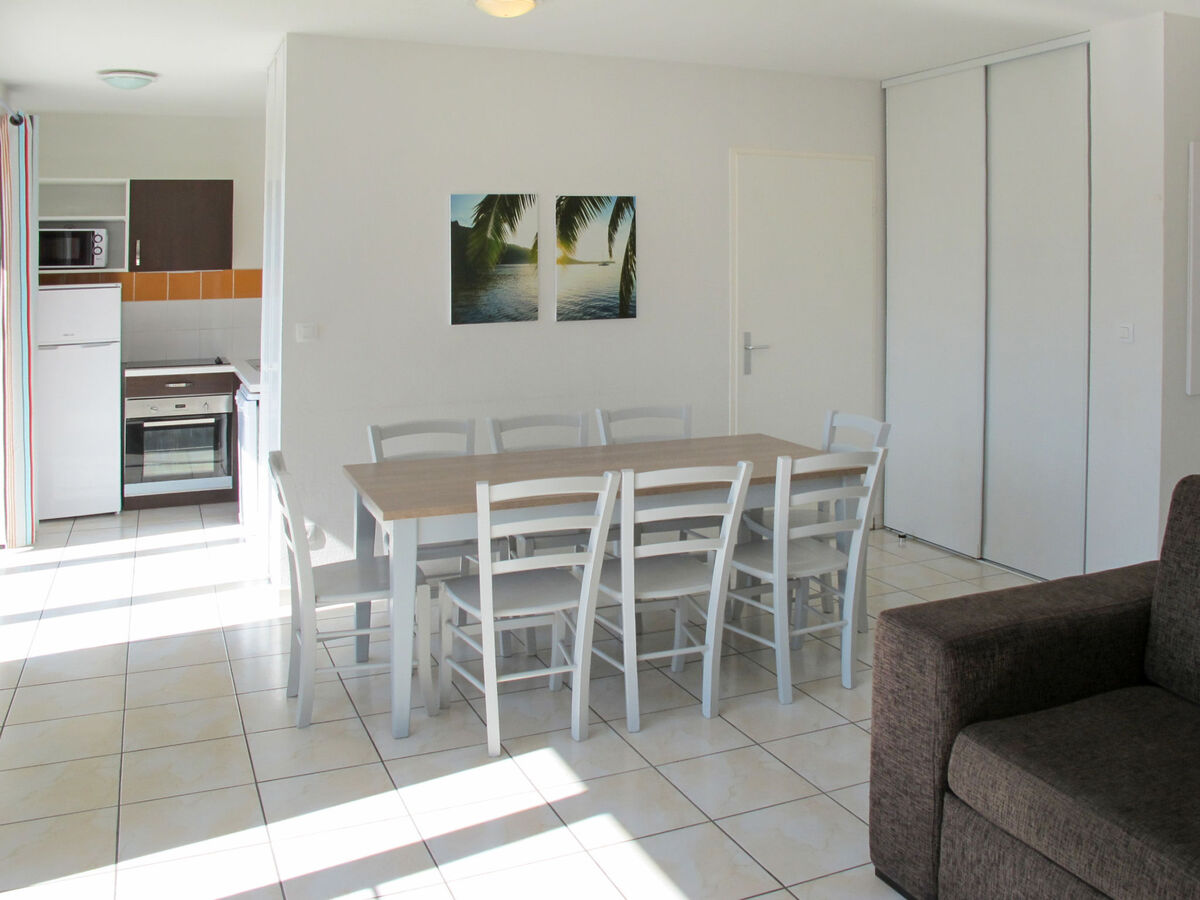 Clair, aménagement moderne: séjour/chambre à coucher avec 1 divan-lit double, table pour les repas et TV.