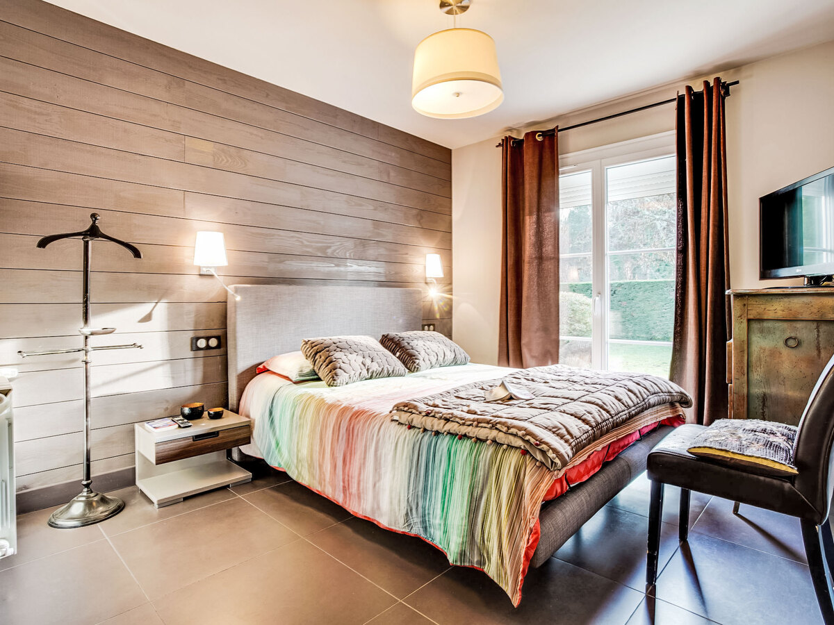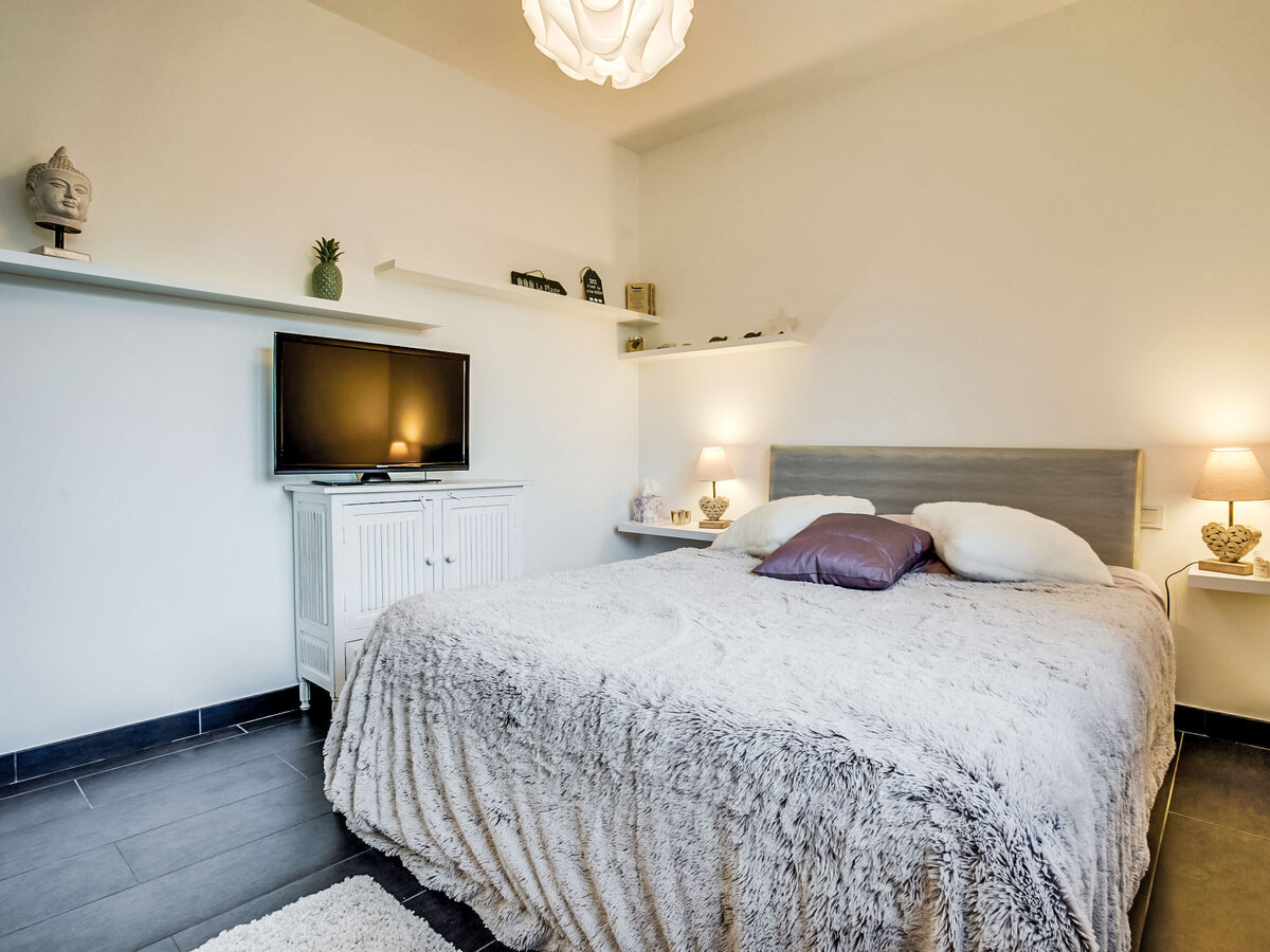 1 chambre avec 1 grand-lit (140 cm, longueur 190 cm), TV (écran plat), volet roulant électrique.