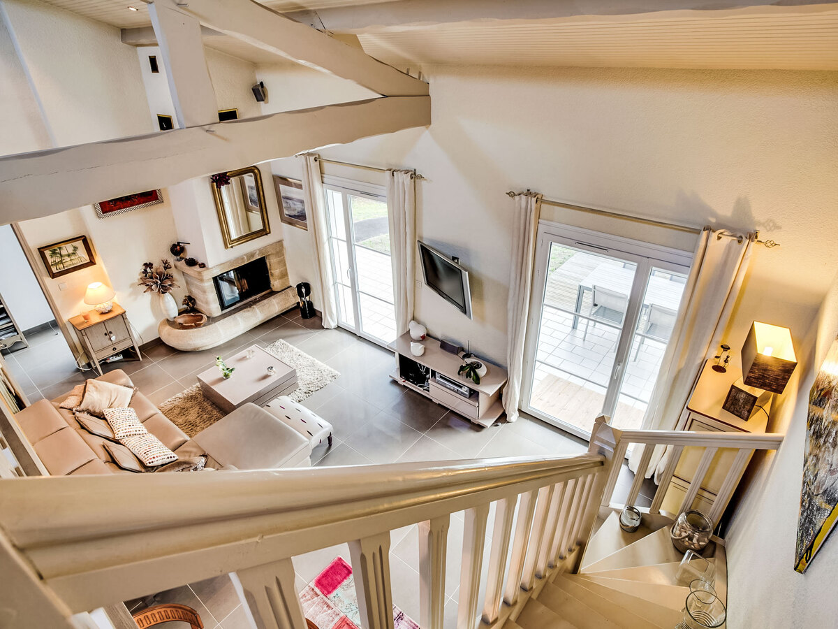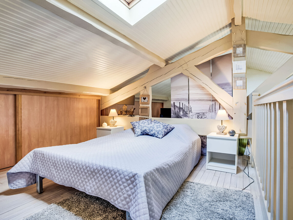 À l'étage supérieur: 1 chambre, mansardée, ouverte avec 1 divan-lit (140 cm, longueur 190 cm).