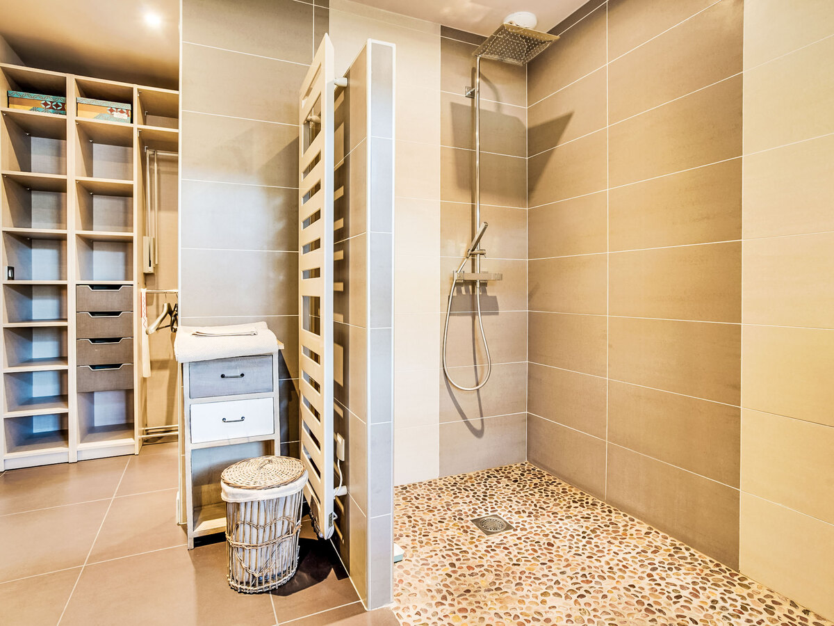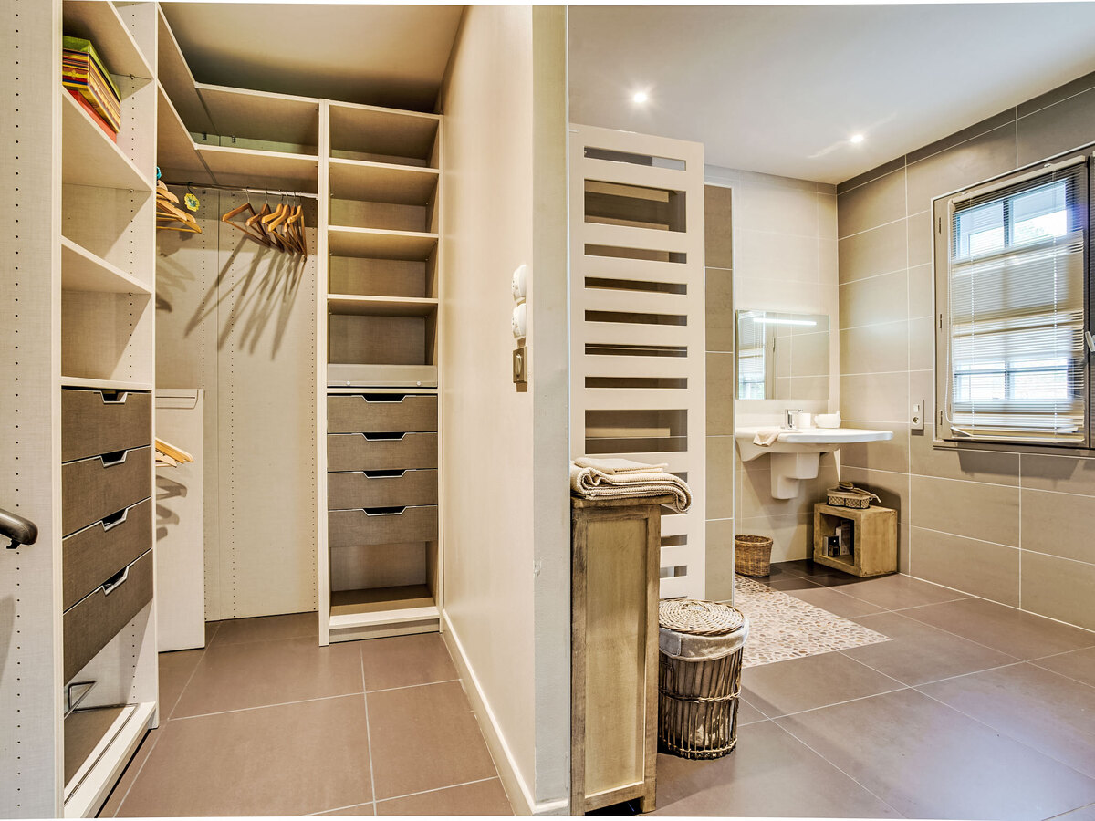 1 grande chambre avec Dressing avec 1 lit double (2 x 80 cm, longueur 200 cm), lavabo, douche/WC et TV (écran plat).