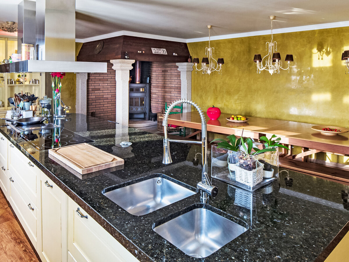 Cuisine ouverte 40 m2 (four, lave-vaisselle, micro-ondes, congélateur, ilot de cuisine) avec table pour les repas, cheminée.