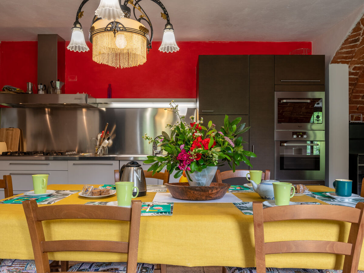 Cuisine (four, lave-vaisselle, 5 feux, grille-pain, bouilloire électrique, micro-ondes, congélateur) avec table pour les repas et poêle à bois.