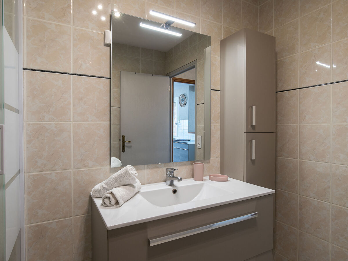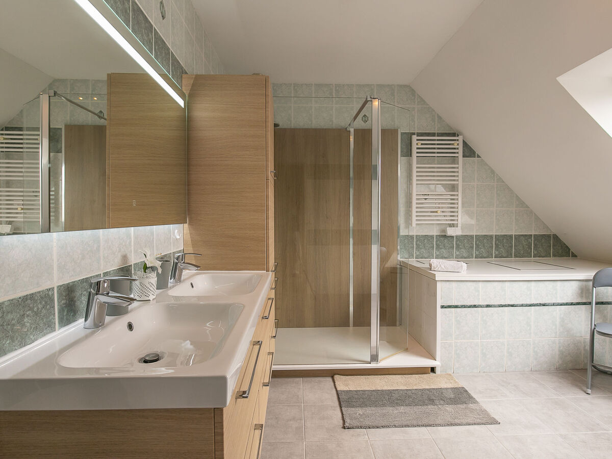 Douche, WC séparé, double vasque.