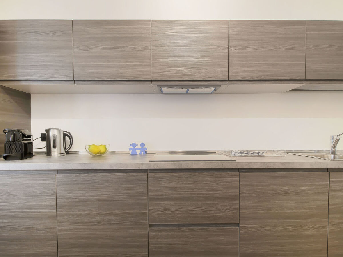 Grande cuisine (lave-vaisselle, 4 plaques à induction, grille-pain, bouilloire électrique, micro-ondes, congélateur, cafetière électrique) avec table pour les repas.