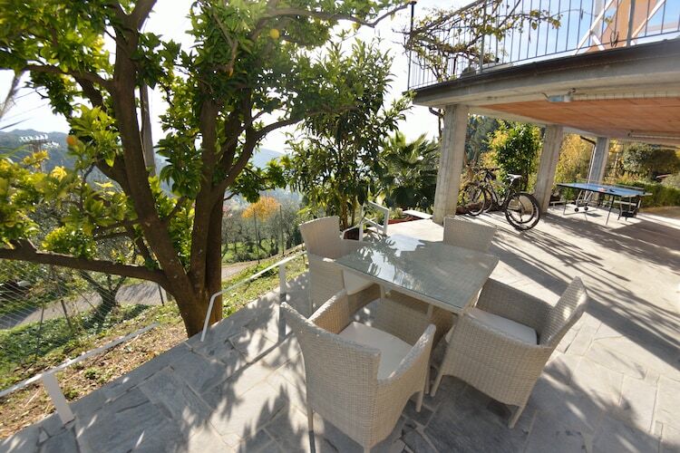 Access within a private entrance gate and small path onto a veranda with a table and chairs, ping-pong table, 1 external bathroom with shower, wc, bidet, basin. Within an external staircase access to the 1st floor and the private terrace (75 sqm) with terracotta tiled floor. Guests have unforgettable views from the terrace onto the green valleys of Camaiore until the sea, the island of Elba and the lake of Massaciuccoli. The terrace with table, chairs, deckchairs and sunbeds invites you to relax, to have an aperitif while admiring the sunset or dine under the starry sky.