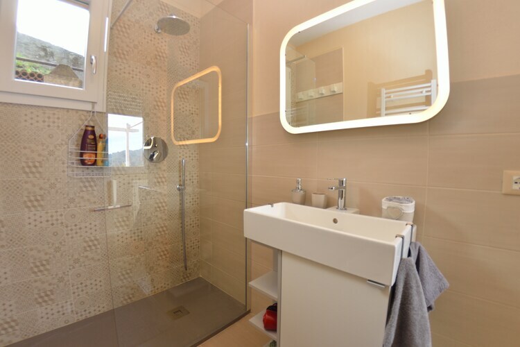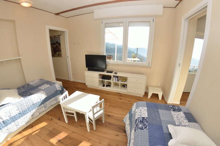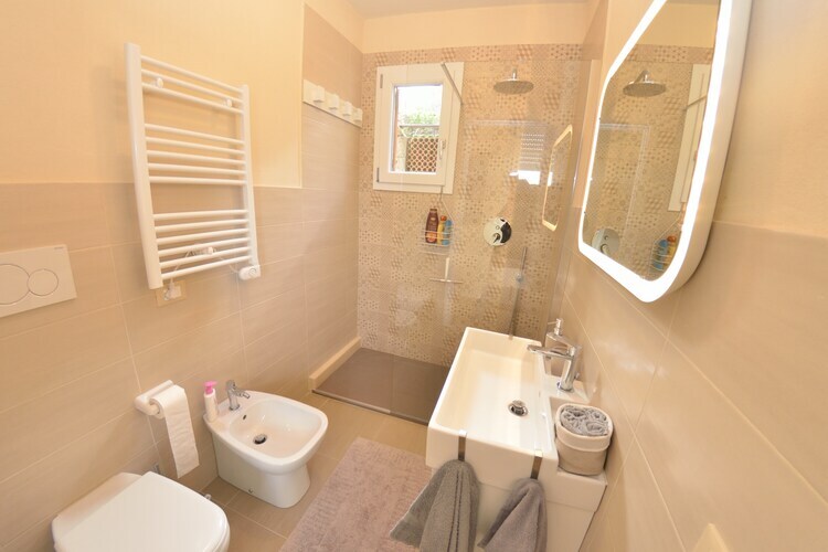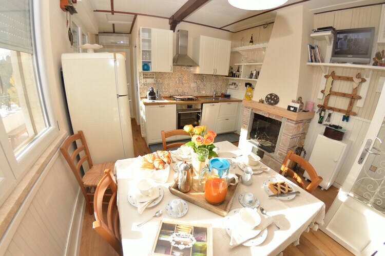 Entrance within the terrace: kitchen with table (extractable for 12 persons), fridge/freezer, stove, oven, dishwasher, washing machine, fire-place (working), TV, 1 bathroom with shower, wc, bidet, basin, 1 walk-through room with 2 single beds, tv, wardrobe, 1 double bedroom with 1 bunkbed and exit onto the terrace.