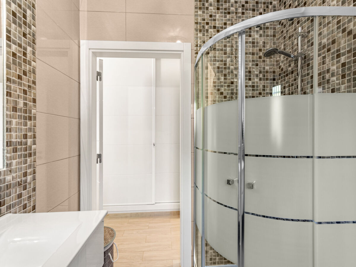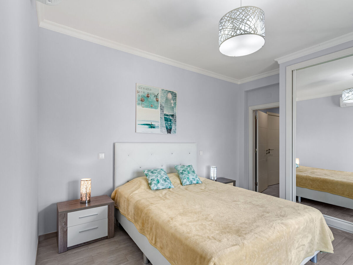 1 chambre avec 1 grand-lit (160 cm, longueur 200 cm), douche/WC et double vasque.