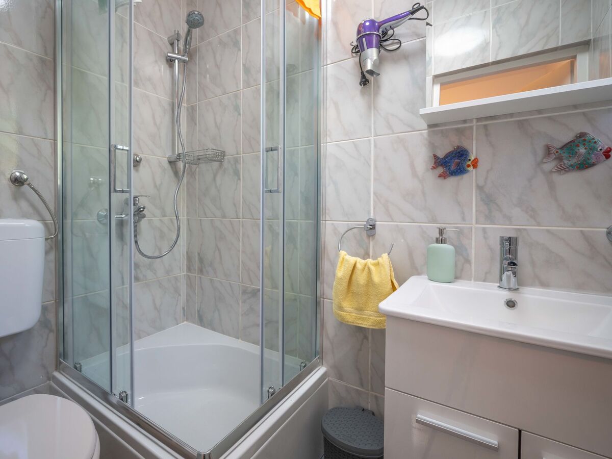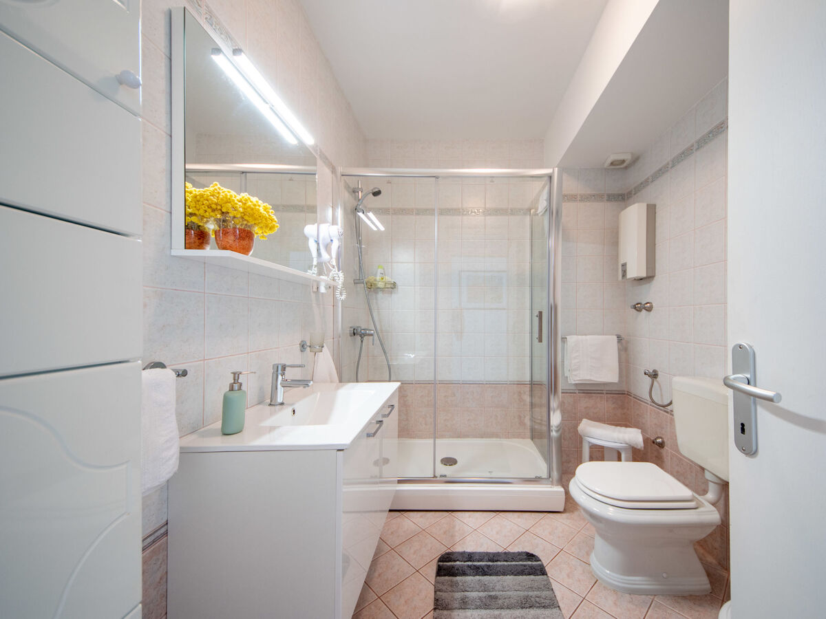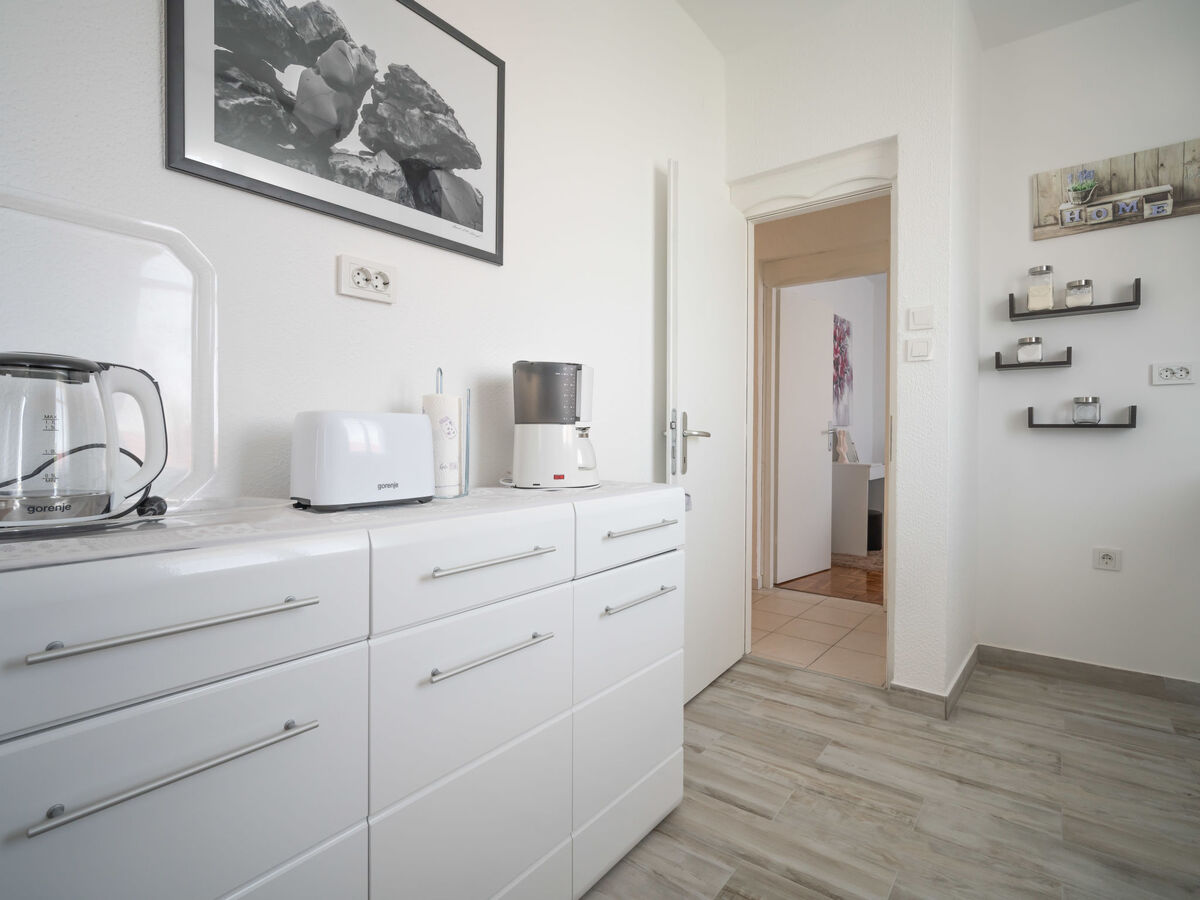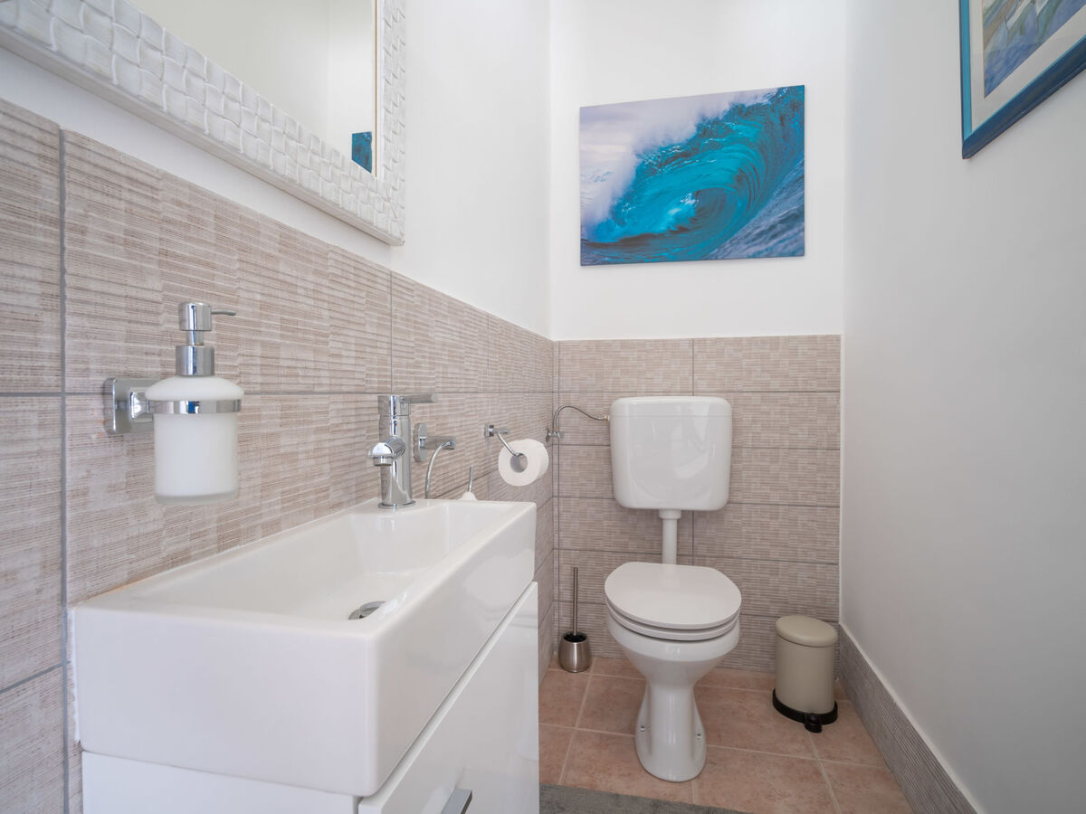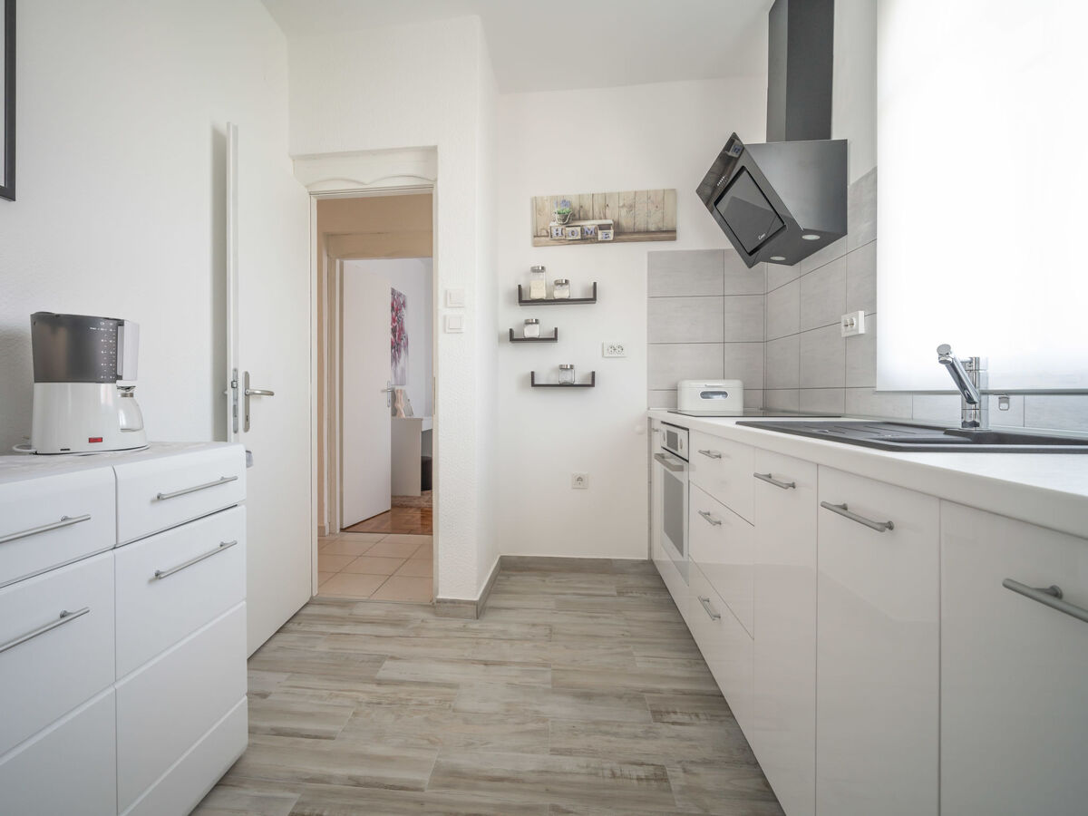 Le troisième appartement au rez-de-chaussée est aménagé sur deux étages: en bas, vous trouverez la salle de bain / WC, puis le salon / salle à manger, au premier étage il y a la cuisine et deux chambres.
