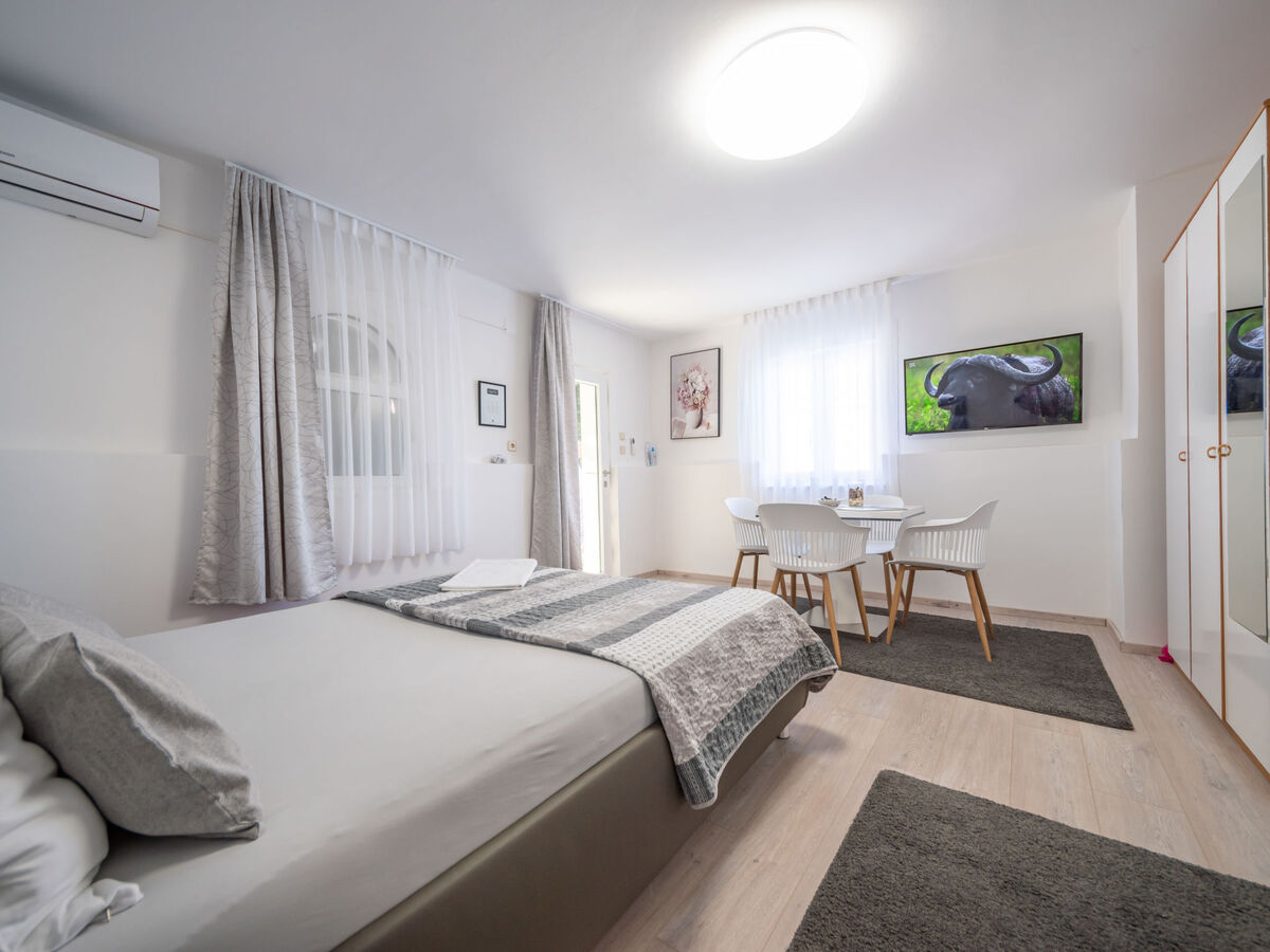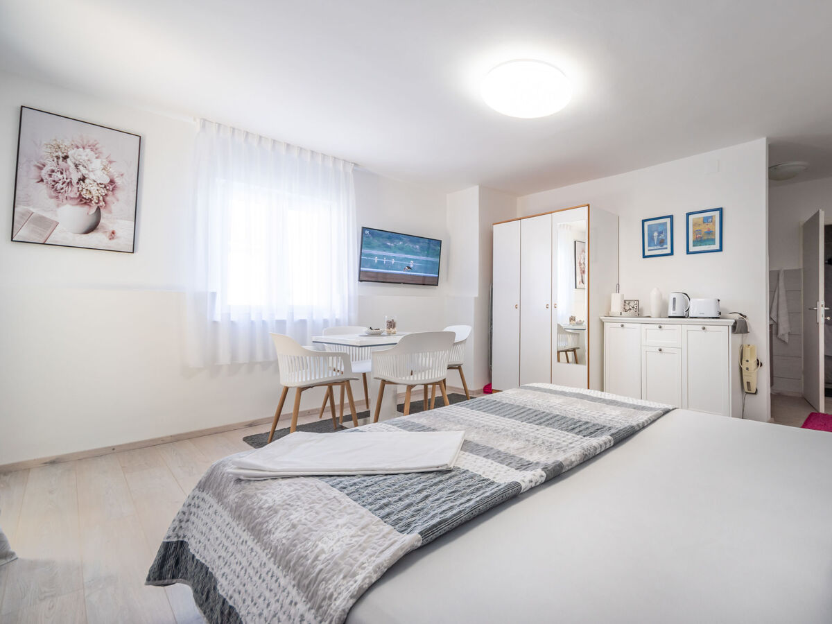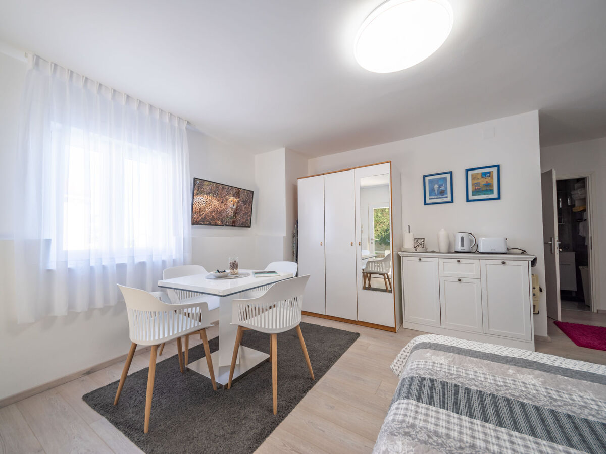 Séjour/chambre à coucher avec 1 grand-lit (160 cm, longueur 200 cm), table pour les repas, coin-cuisine et TV (satellite) (écran plat), air-conditionné.
