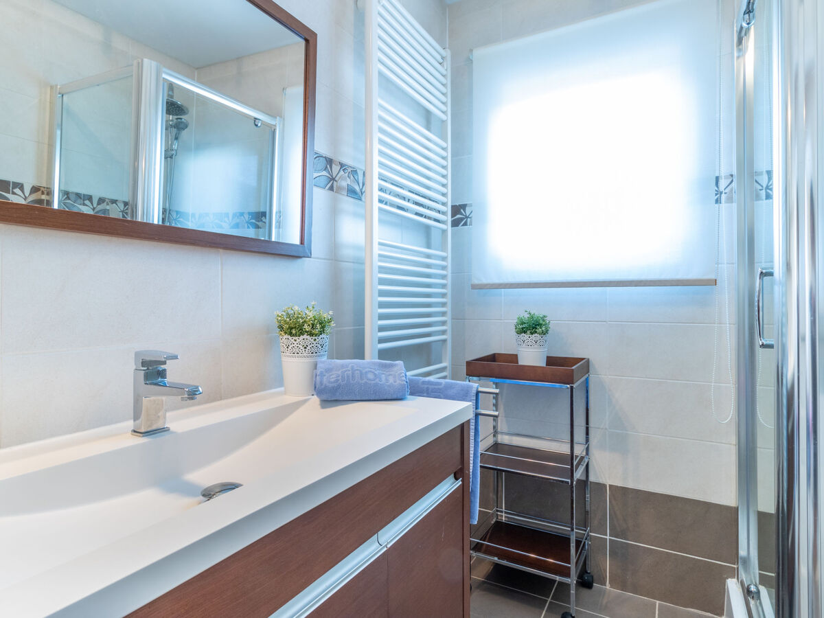 Clair, rénovée en 2017, aménagement fonctionnel et plaisant: séjour/salle à manger avec table pour les repas et TV (satellite) (écran plat), air-conditionné et chauffage à air chaud.