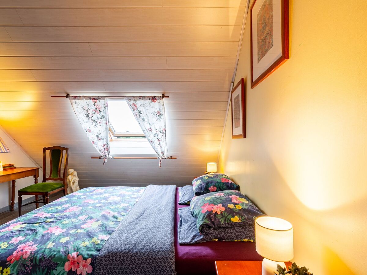À l'étage supérieur: chambre avec passage mansardée avec fenêtre sous le toit avec 1 grand-lit (160 cm).