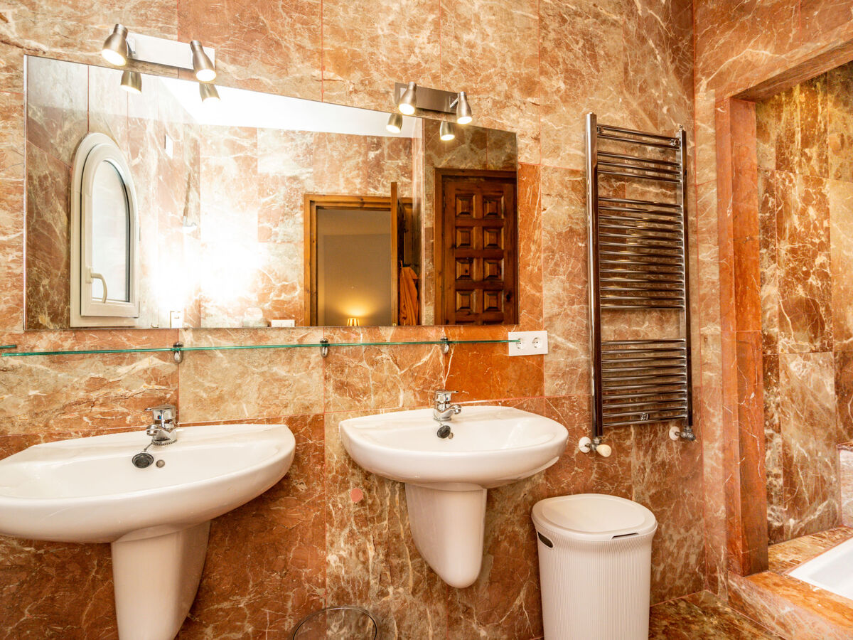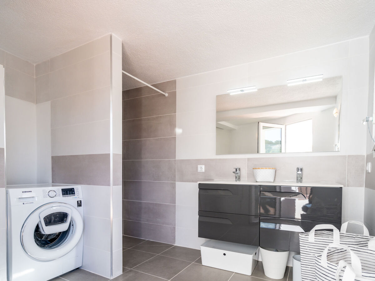 1 chambre avec 1 grand-lit (180 cm, longueur 200 cm), douche/WC, double vasque et air-conditionné.