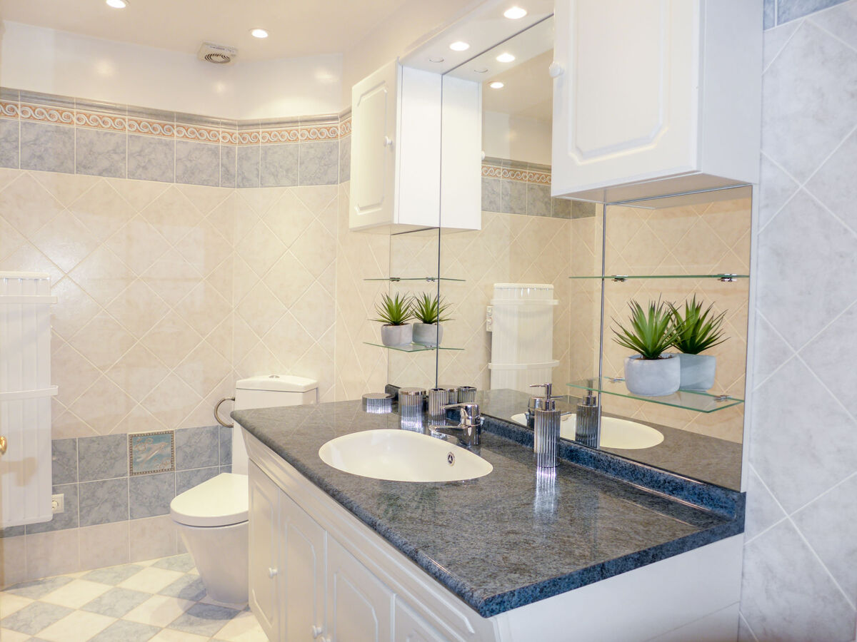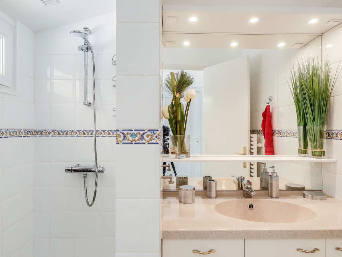 À l'étage inférieur: 1 grande chambre avec Dressing avec 1 grand-lit (1 x 180 cm, longueur 200 cm), salle de bains, WC séparés, bain/douche, double vasque, bain à remous et air-conditionné.