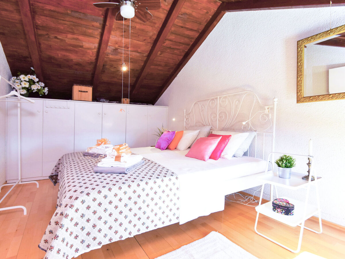 1 chambre, mansardée avec 1 lit double (180 cm, longueur 200 cm), TV (satellite) (écran plat), ventilateur.