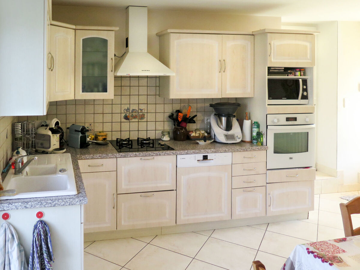 Grande cuisine ouverte (four, lave-vaisselle, 2 plaques à induction, 2 feux, grille-pain, bouilloire électrique, micro-ondes, congélateur, cafetière électrique, Capsules pour machine à café (Nespresso) (NON INCLUSES)) avec petite table pour les repas.