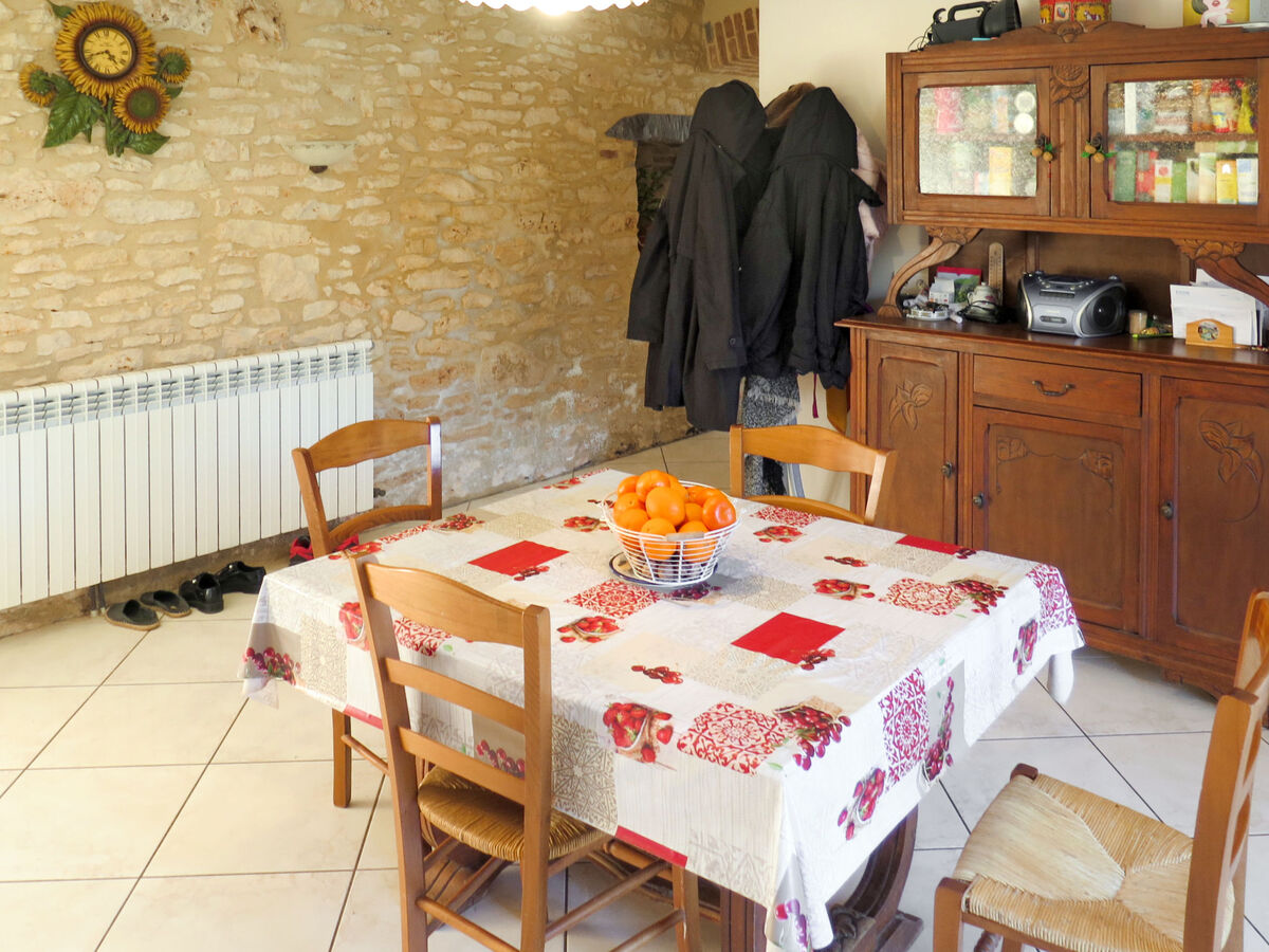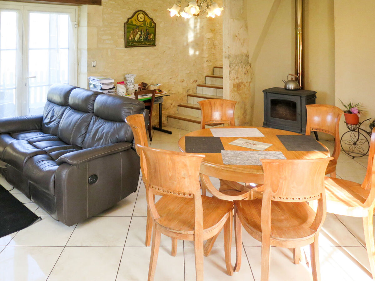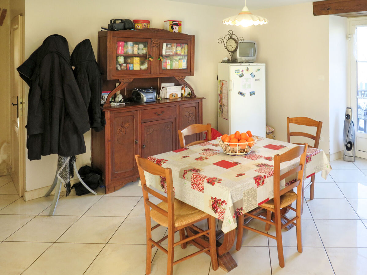 Aménagement confortable et agréable: séjour/salle à manger avec table pour les repas, TV (satellite), radio, DVD et poêle à bois.