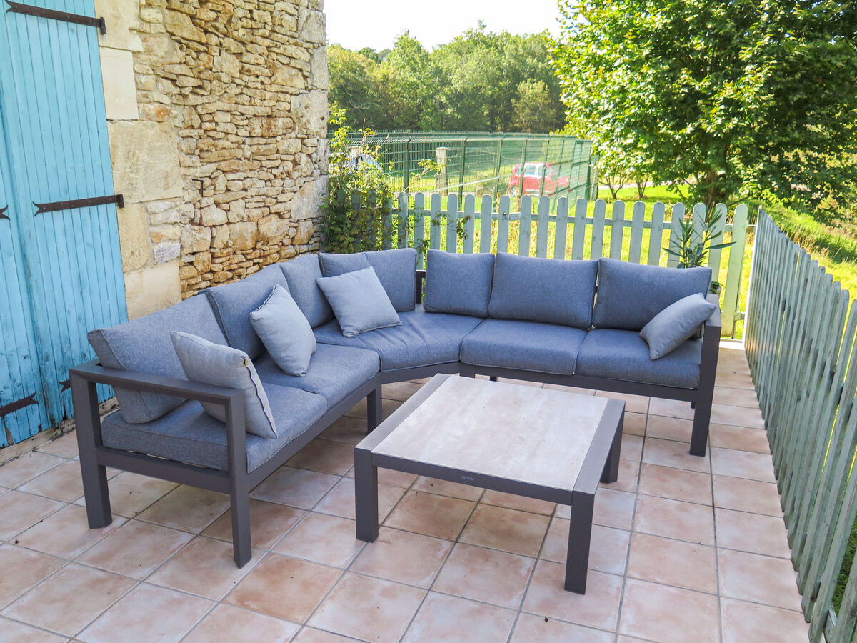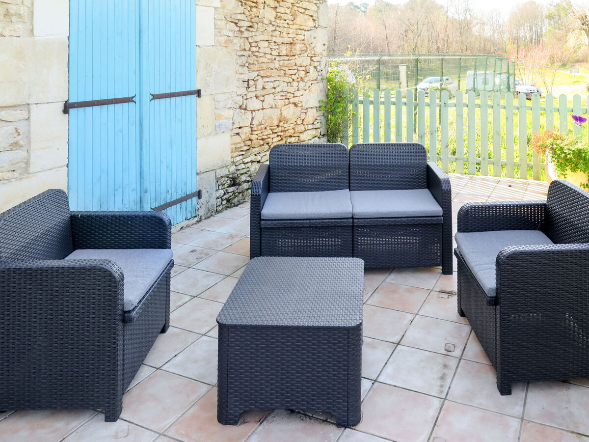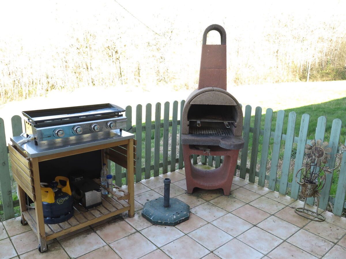 Meubles de terrasse, barbecue, chaises longues (8), réduit.