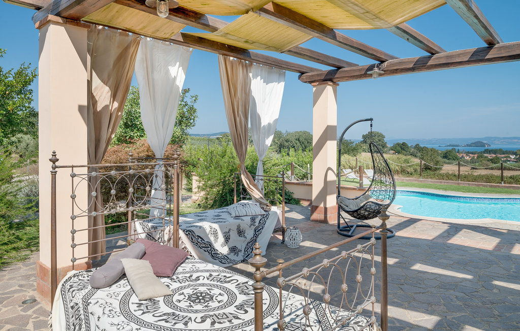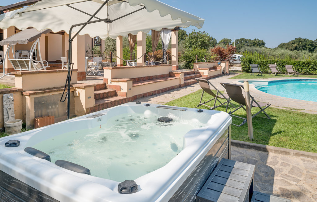 Bien-être à l'extérieur : Location de vacances disposant de chaises-longues et d'un ou plusieurs équipements tels que piscine extérieure, jacuzzi extérieur, lit à baldaquin de jardin etc...