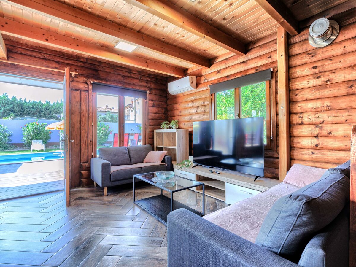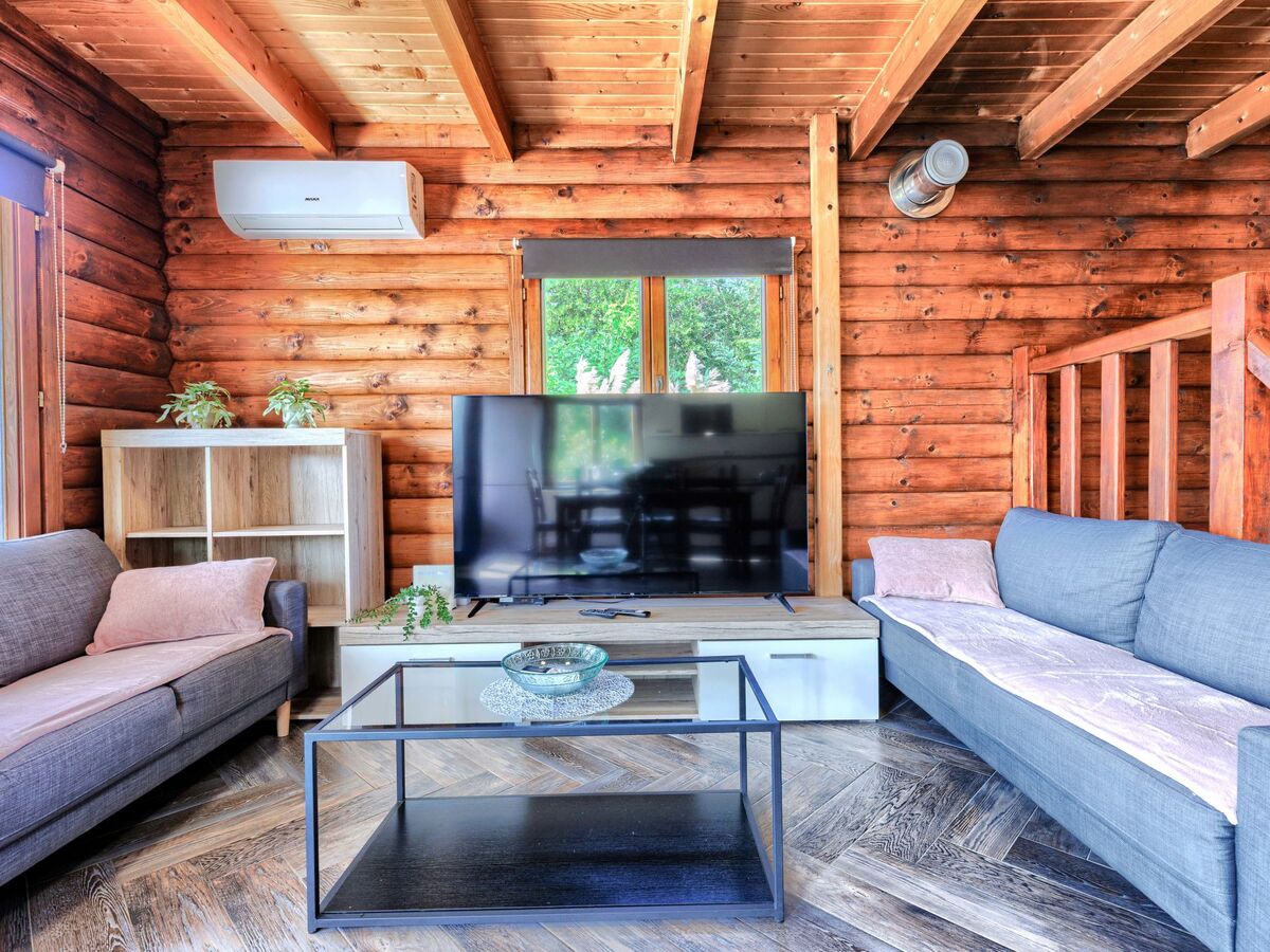 Séjour/salle à manger avec TV (satellite) (écran plat), poêle à bois et air-conditionné.