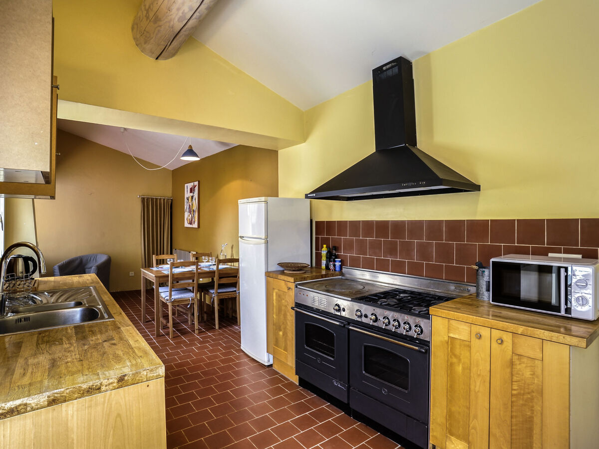 Cuisine (four, lave-vaisselle, micro-ondes) avec table pour les repas.
