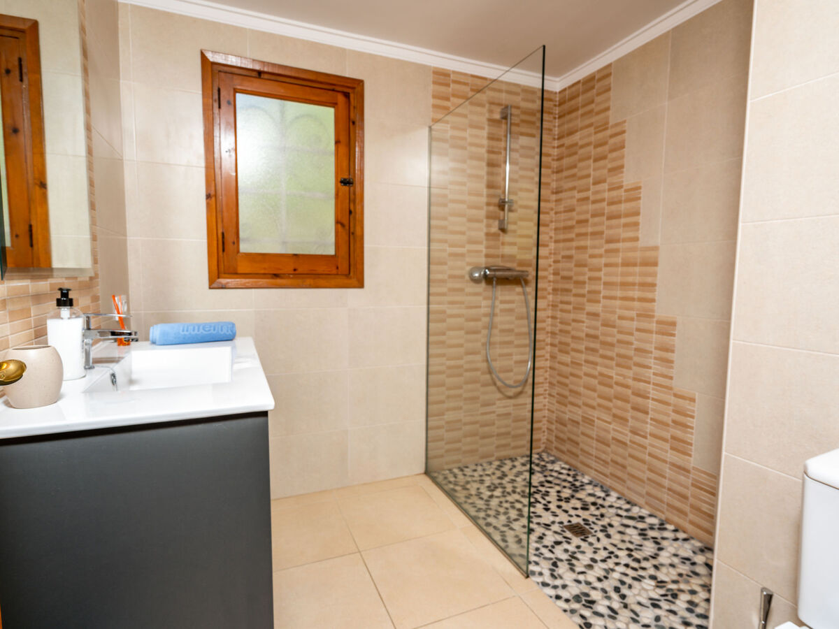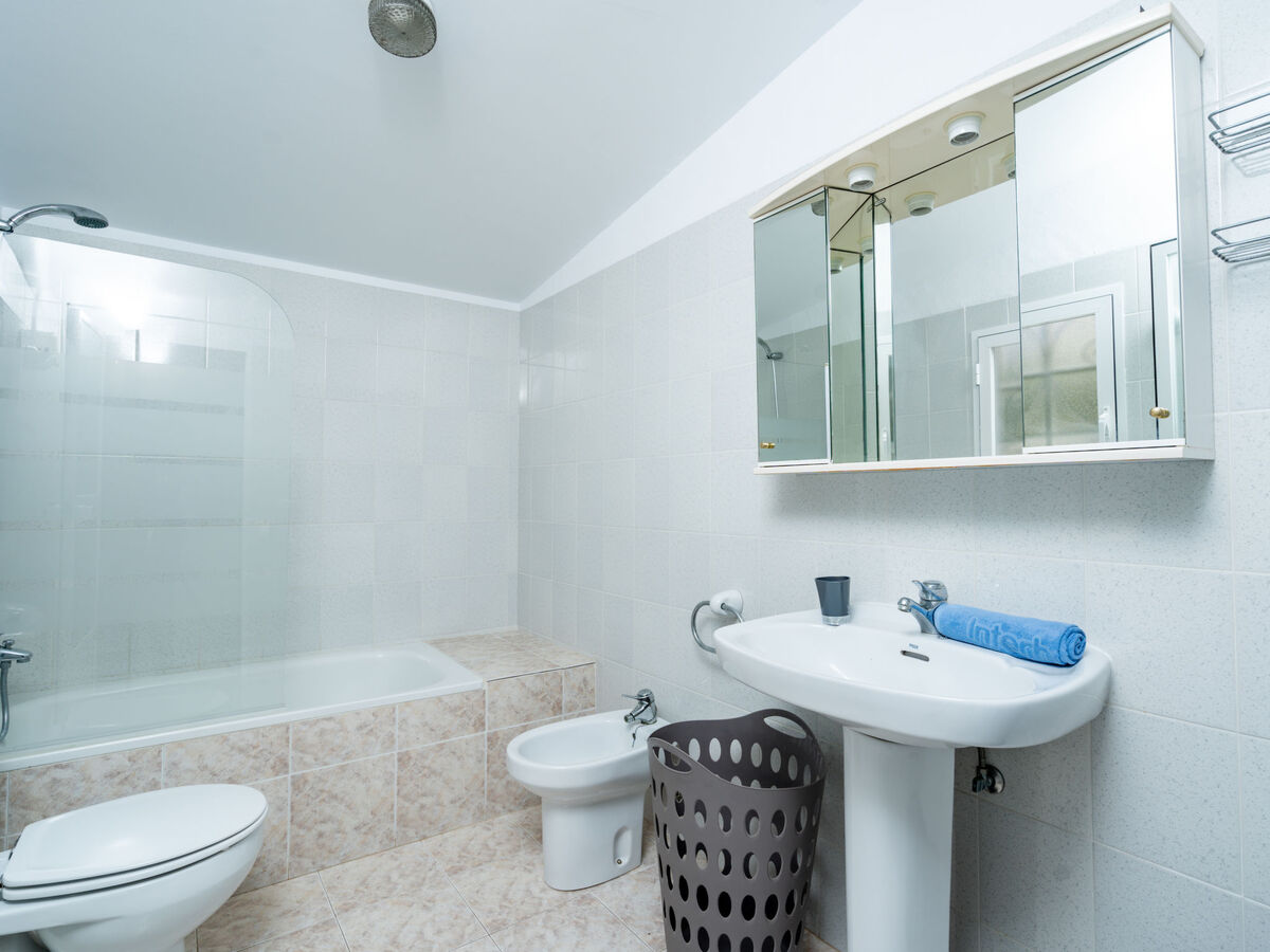 À l'étage supérieur: (escalier extérieur) 1 chambre avec 1 grand-lit (160 cm, longueur 200 cm), bain/bidet/WC et air-conditionné.