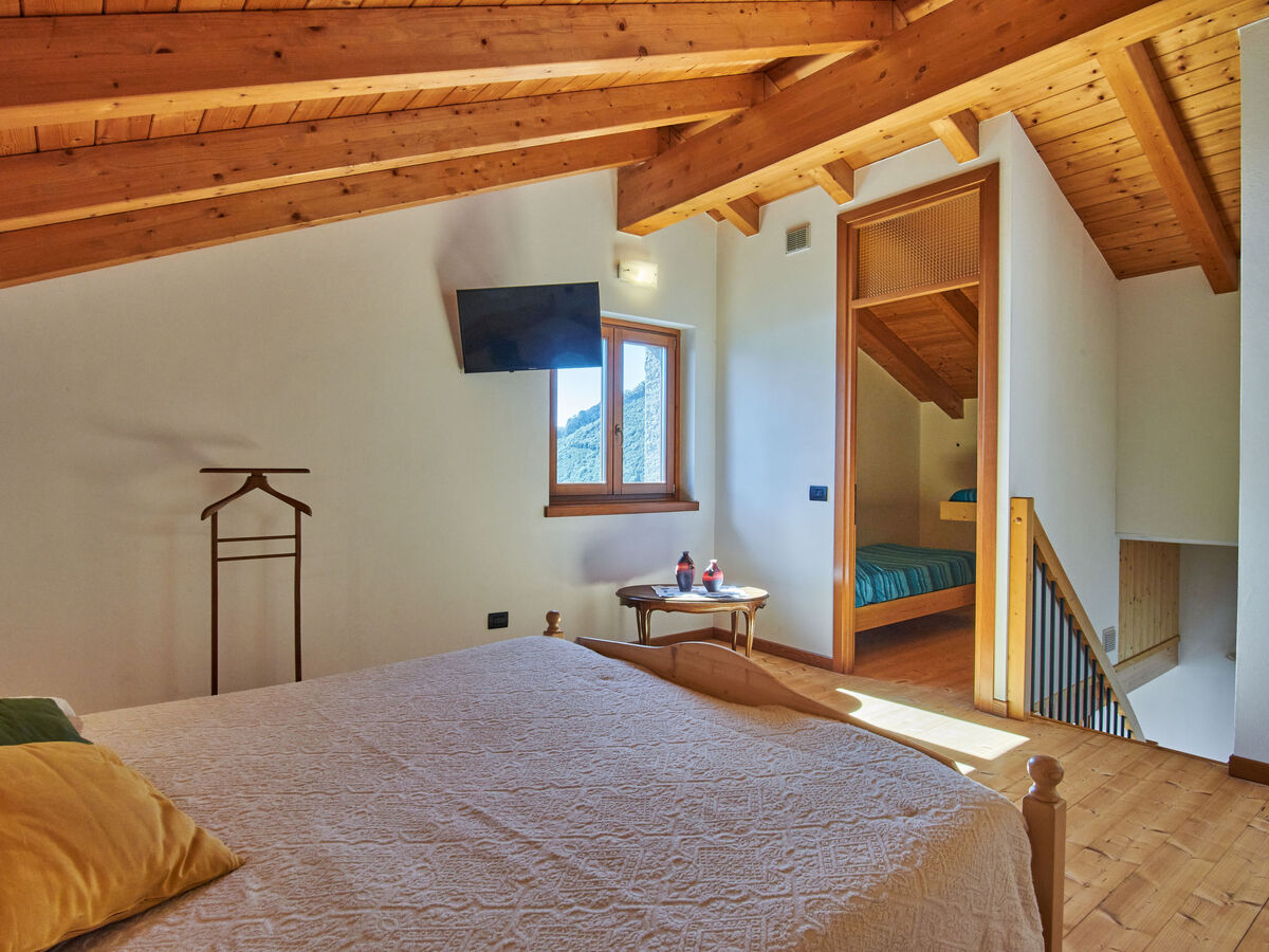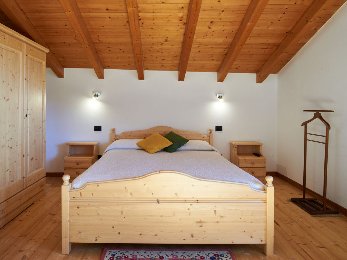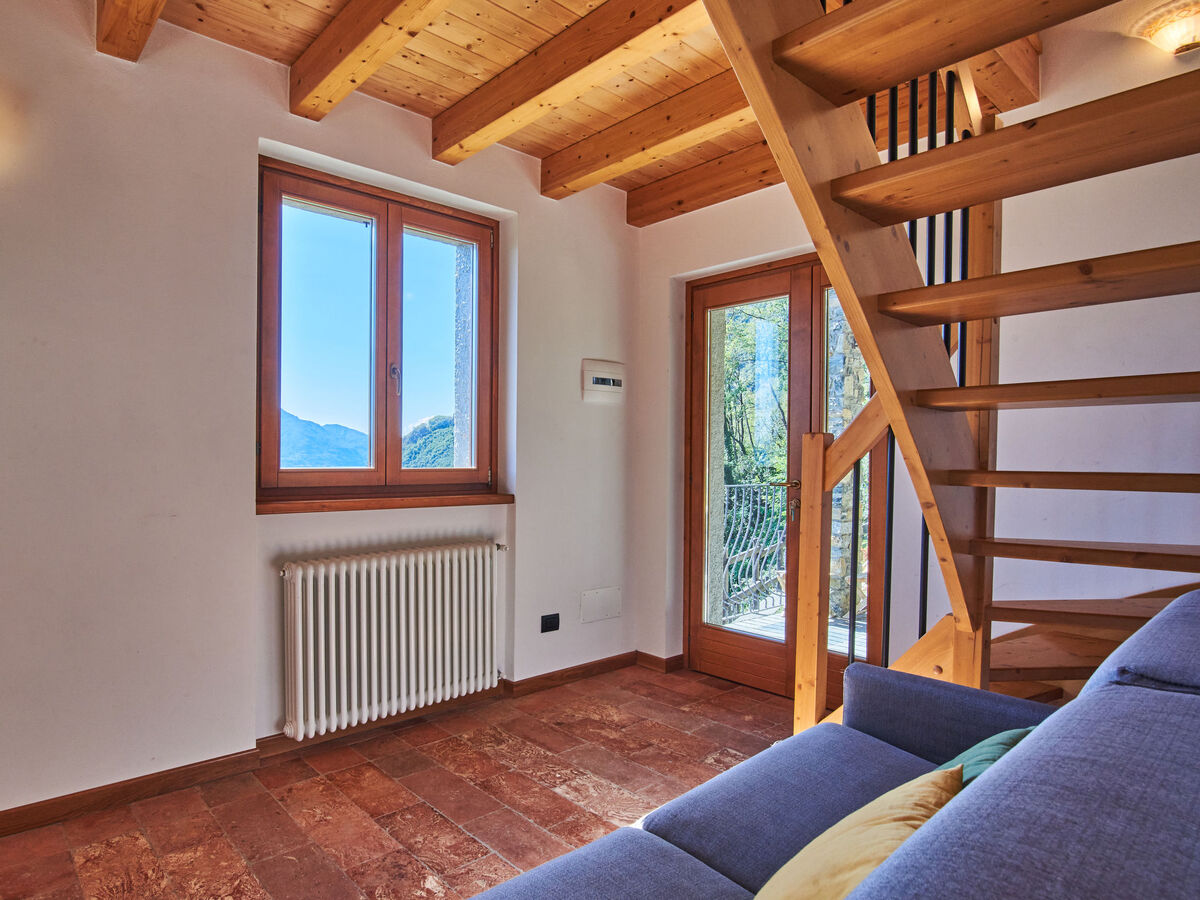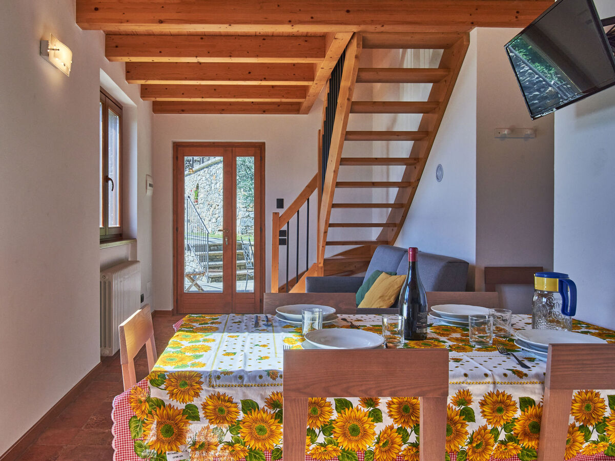 Rénovée en 2018, aménagement agréable et avec beaucoup de bois: à l'étage supérieur: séjour/chambre à coucher avec 1 divan-lit double, table pour les repas et TV.