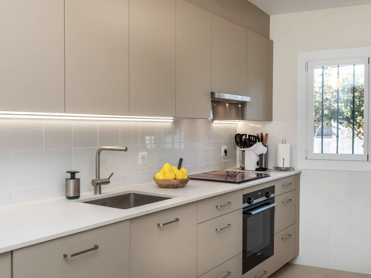 Grande cuisine (four, lave-vaisselle, 3 plaques à induction, grille-pain, bouilloire électrique, micro-ondes, congélateur, cafetière électrique, Capsules pour machine à café (Dolce Gusto) (NON INCLUSES)) avec petite table pour les repas.