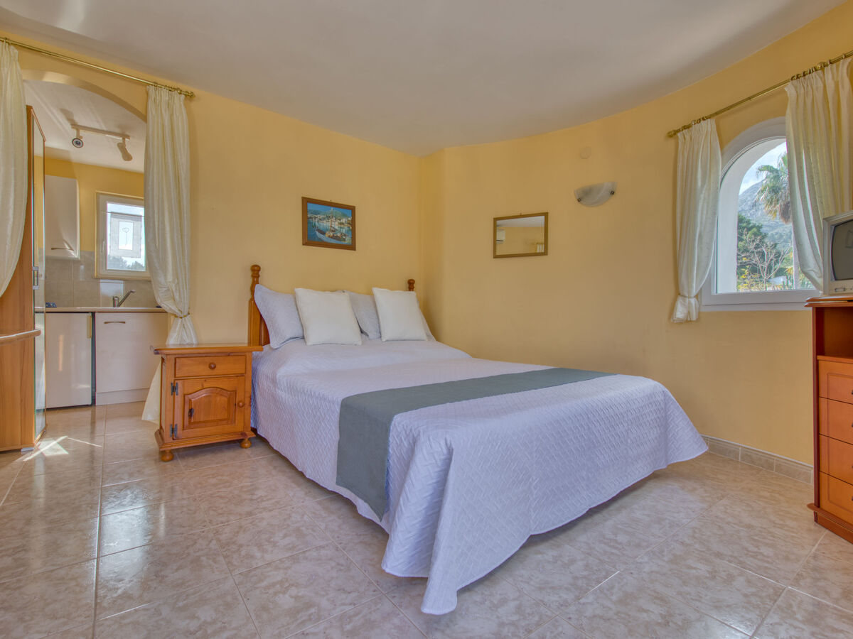 À l'étage supérieur: (escalier extérieur) 1 chambre avec 1 grand-lit (140 cm, longueur 180 cm), coin-cuisine, douche/WC, air-conditionné et chauffage à air chaud.