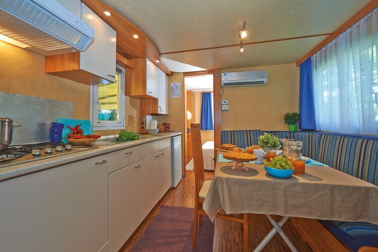 Salle de séjour(Canapé-lit simple, TV(satellite)), coin cuisine, chambre(lit double), chambre(lit simple, lit simple), salle de bains(douche, lavabo, WC), véranda, climatisation, mobilier de jardin, transats, parking, piscine(partagé avec d'autres clients)