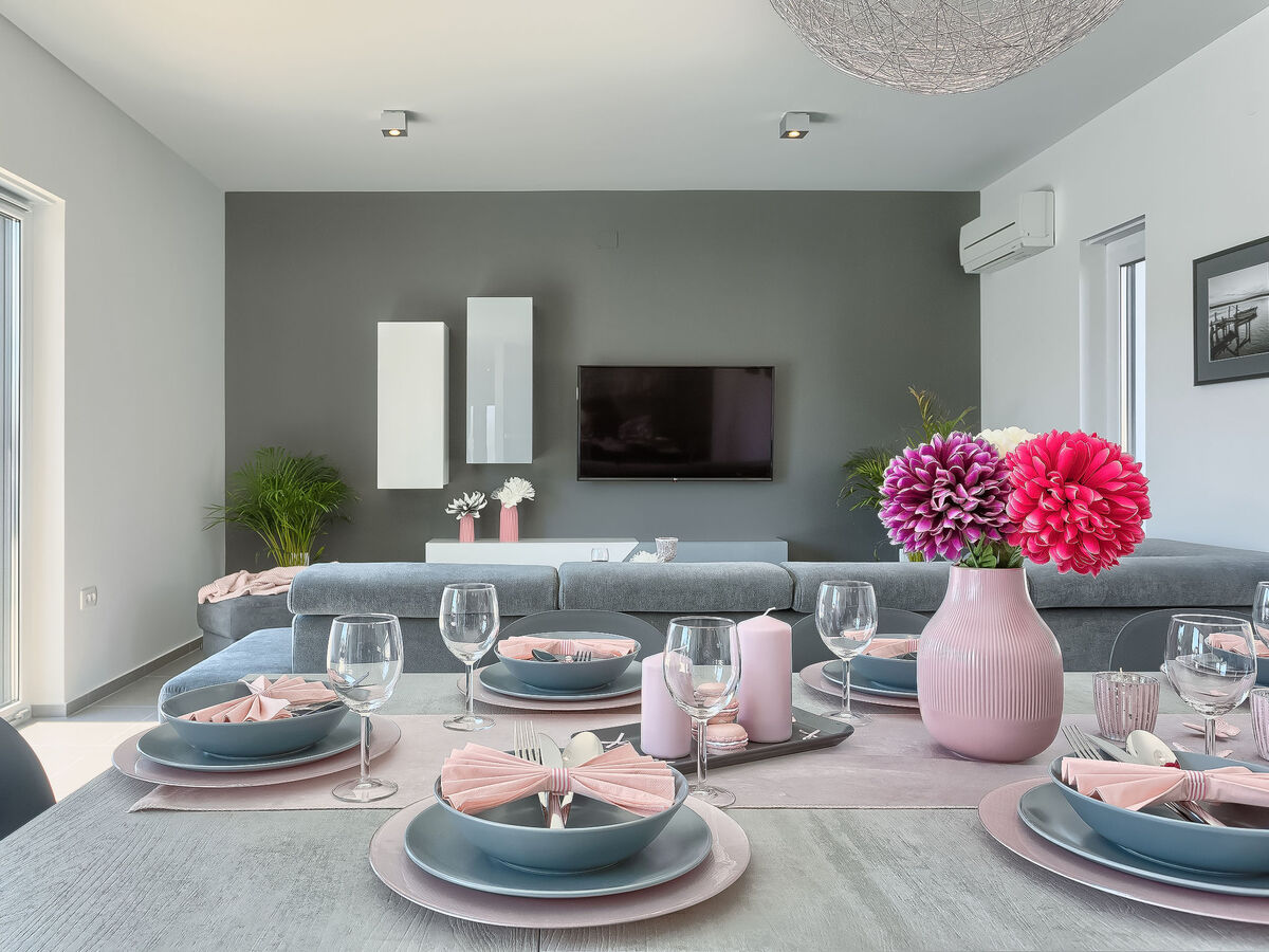 Aménagement moderne: séjour/salle à manger avec TV (satellite) (écran plat), air-conditionné.