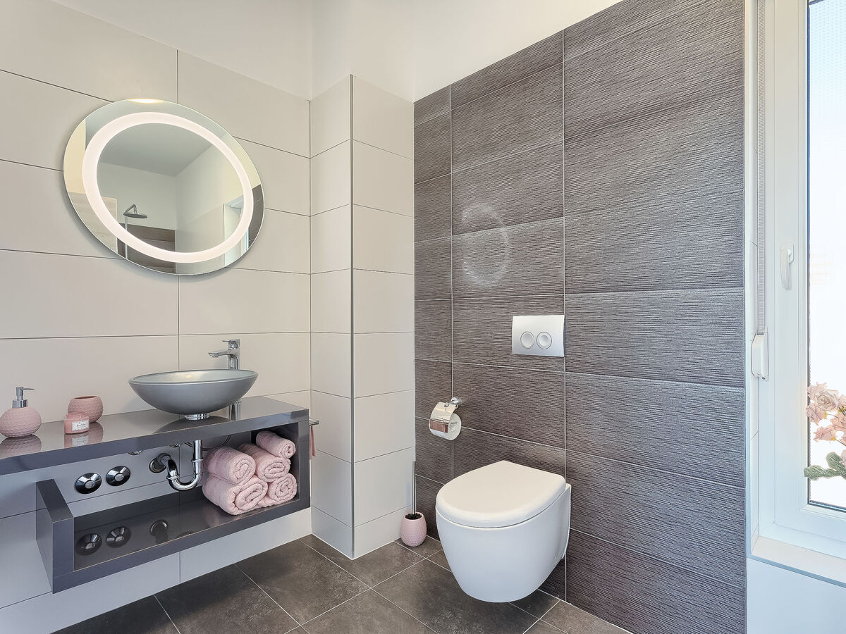 A usage privé: terrain 600 m2 (clôturé), beau jardin avec pelouse, piscine rectangulaire (8 x 4 m, profondeur 140 cm, disponibilité saisonnière: 04.Avr.