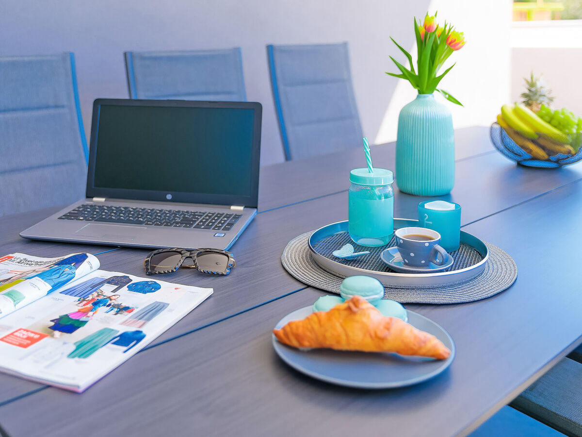 Cuisine ouverte (four, lave-vaisselle, 4 plaques vitrocéramiques, micro-ondes, congélateur, cafetière électrique).
