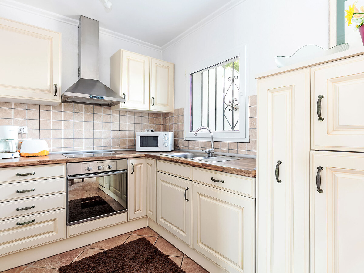 Cuisine ouverte (four, lave-vaisselle, 4 plaques vitrocéramiques, grille-pain, bouilloire électrique, micro-ondes, congélateur).
