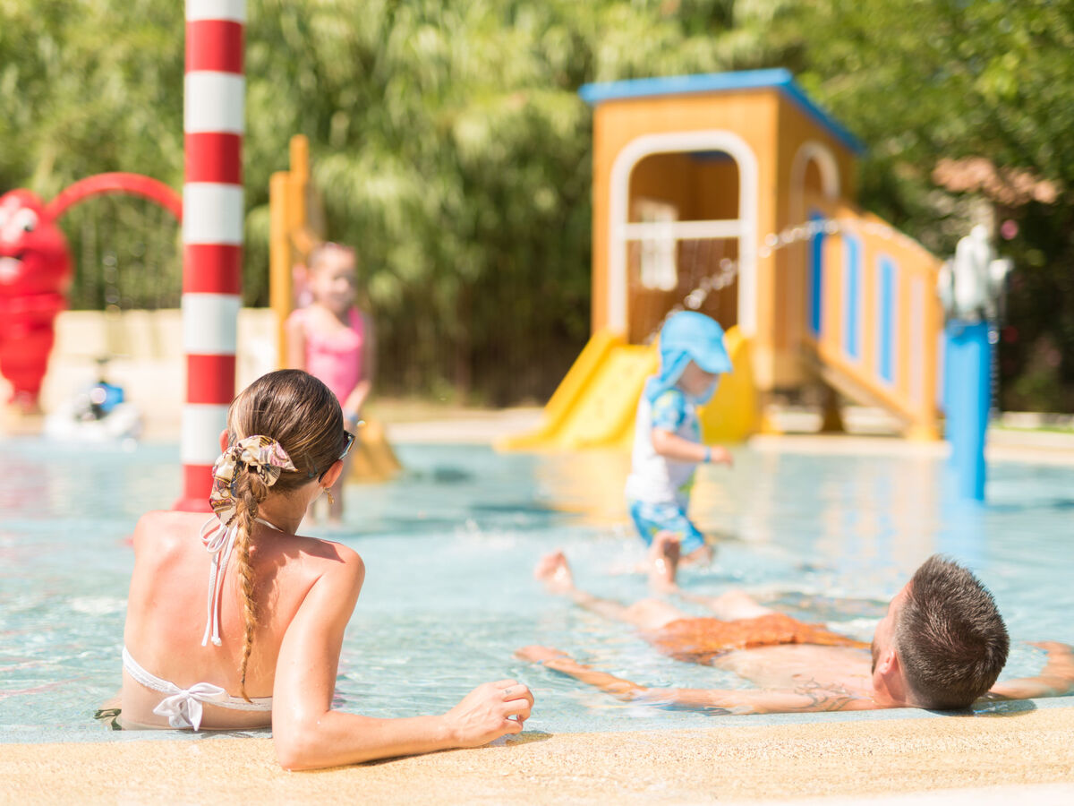 Bassin pour les enfants, toboggan, ping-pong, terrain de pétanque, terrasse, espace de jeux pour les enfants.