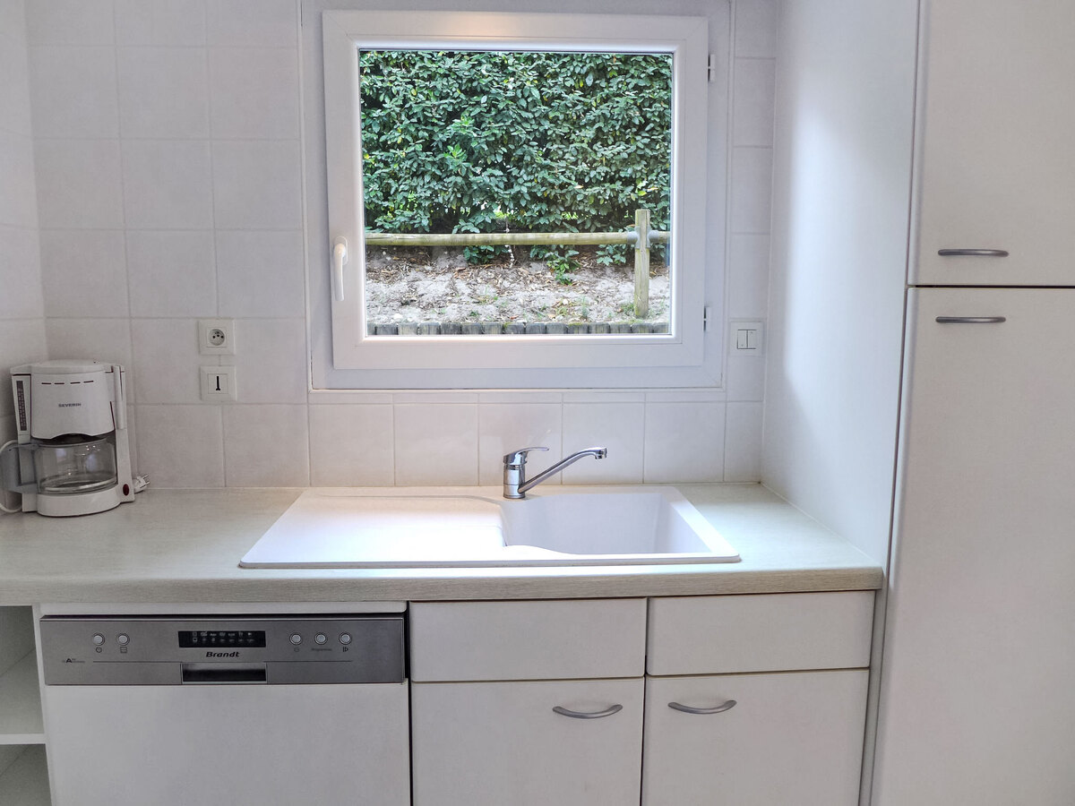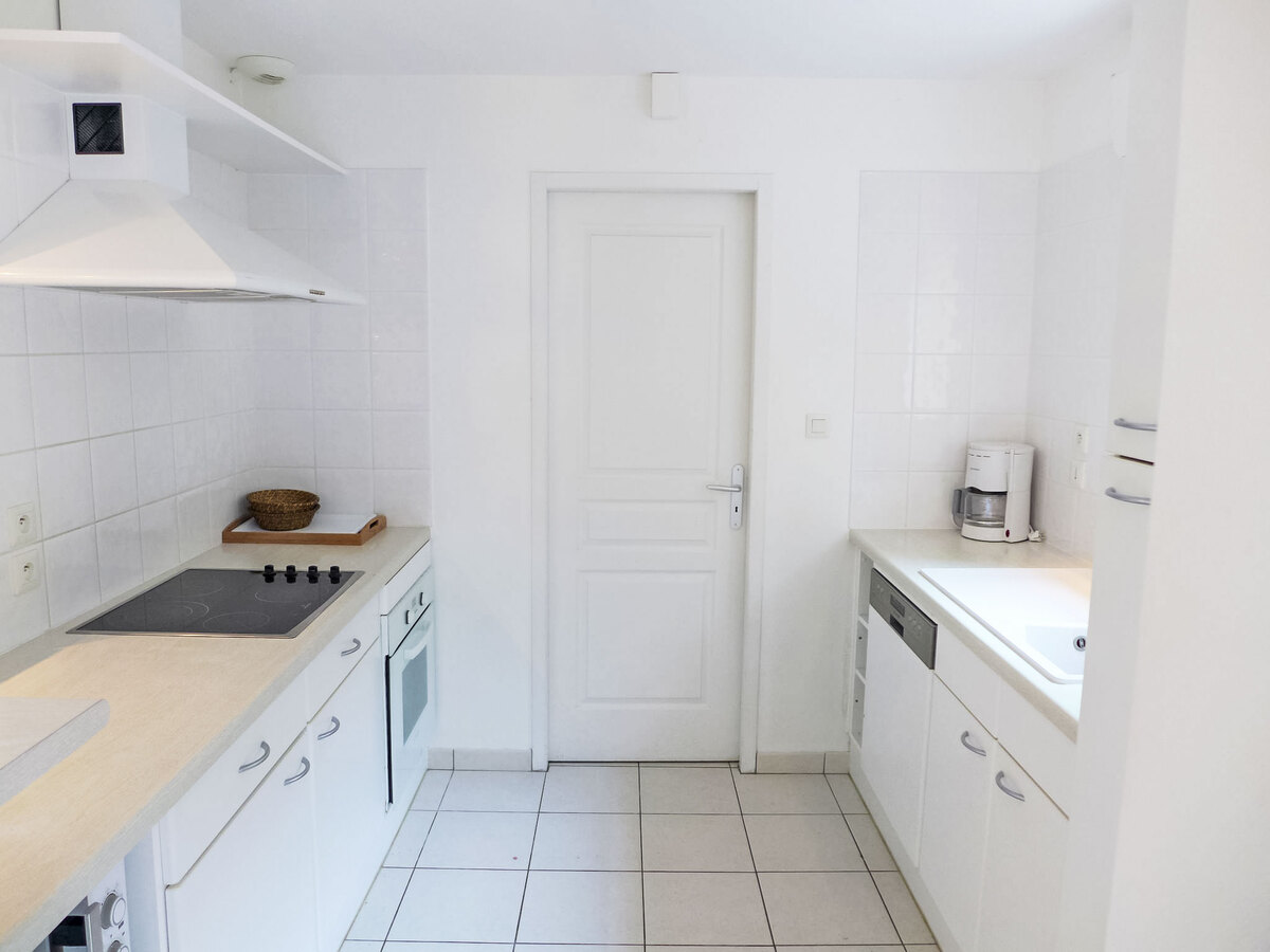 Cuisine ouverte (four, lave-vaisselle, 4 plaques vitrocéramiques, bouilloire électrique, micro-ondes, congélateur, cafetière électrique, Capsules pour machine à café (Nespresso Krups) (NON INCLUSES)) avec bar.
