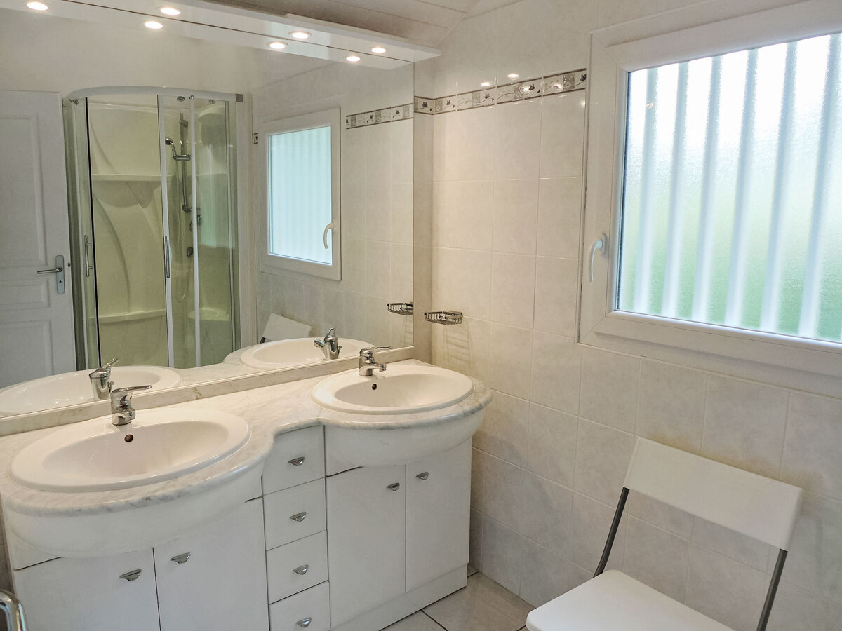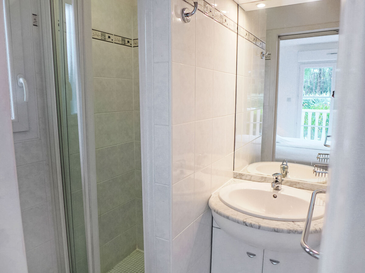 1 chambre avec 1 lit double (2 x 90 cm), lavabo et douche.