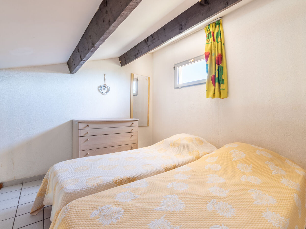 À l'étage supérieur: (escalier raide) galerie mansardée, hauteur plafond 130 - 220 cm avec 2 lits (80 cm, longueur 185 cm).