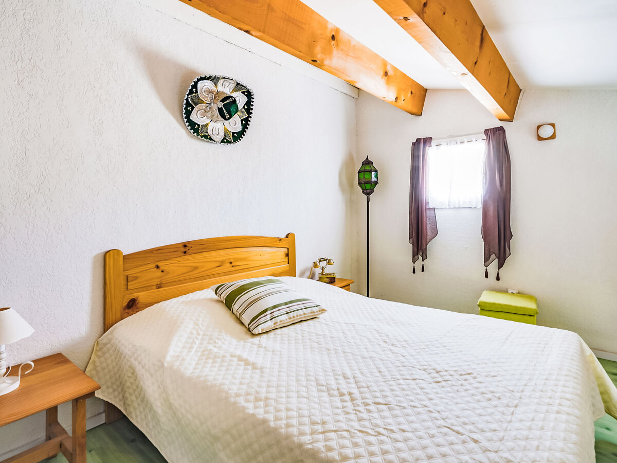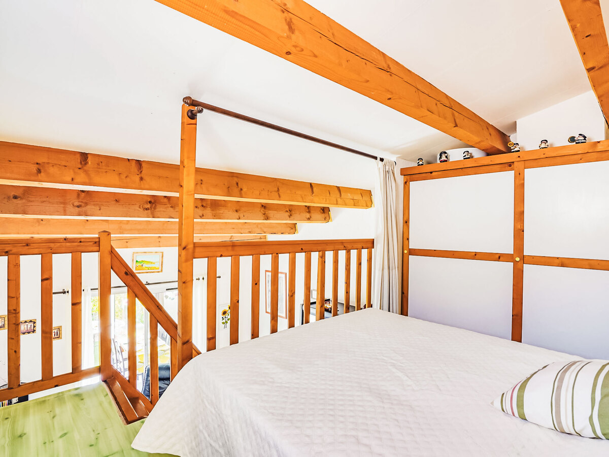 À l'étage supérieur: galerie mansardée avec 1 grand-lit (140 cm, longueur 190 cm).