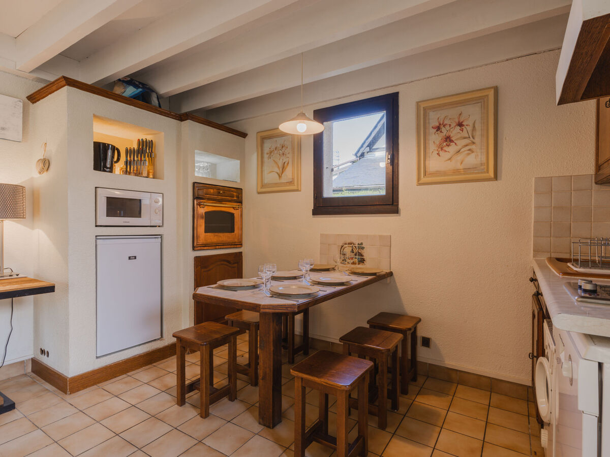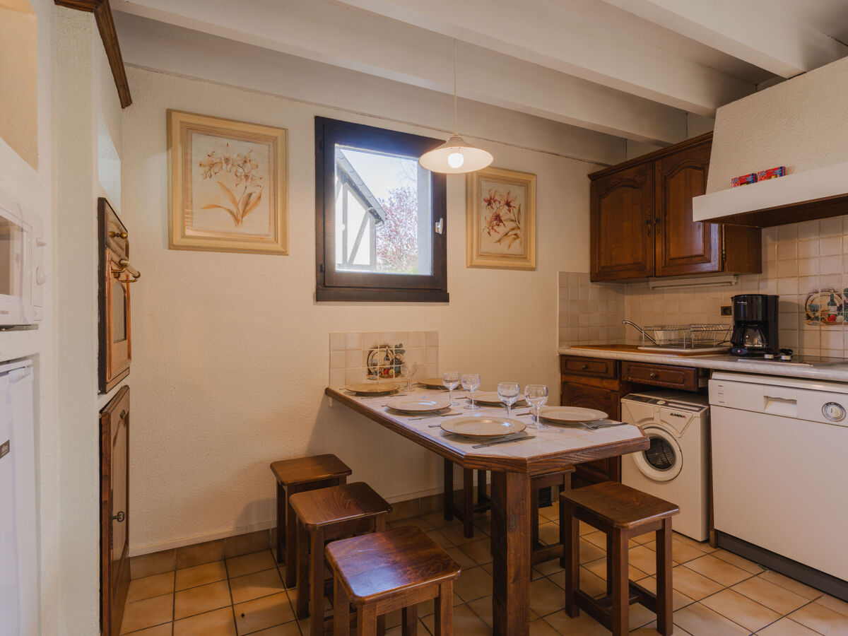 Coin cuisine (2 plaques de cuisson, four, lave-vaisselle, grille-pain, bouilloire électrique, micro-ondes, cafetière électrique) avec table pour les repas.
