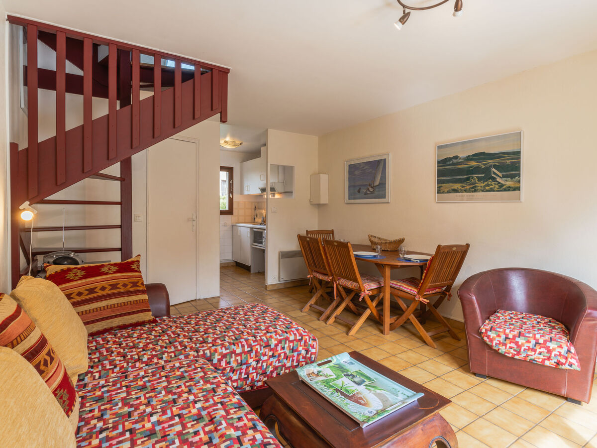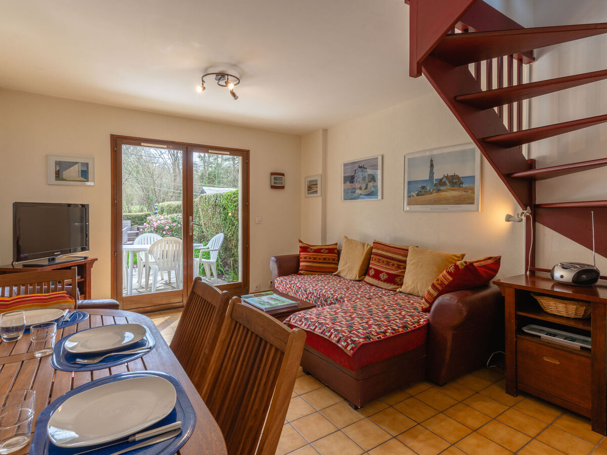 Séjour/salle à manger avec 1 divan-lit (130 cm, longueur 190 cm), TV (écran plat), radio et lecteur CD.