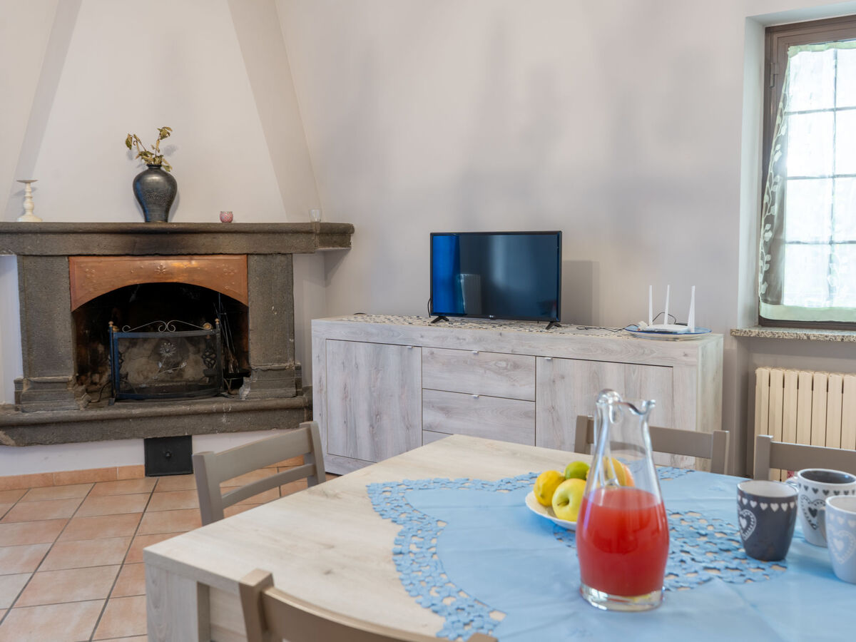 Clair, aménagement rustique: séjour/salle à manger avec cheminée, table pour les repas et TV.