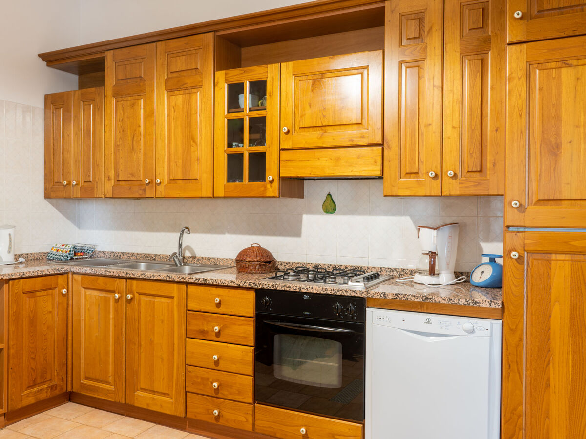 Cuisine (four, lave-vaisselle, 4 feux, grille-pain, bouilloire électrique, congélateur, cafetière électrique) avec table pour les repas et coin repas.