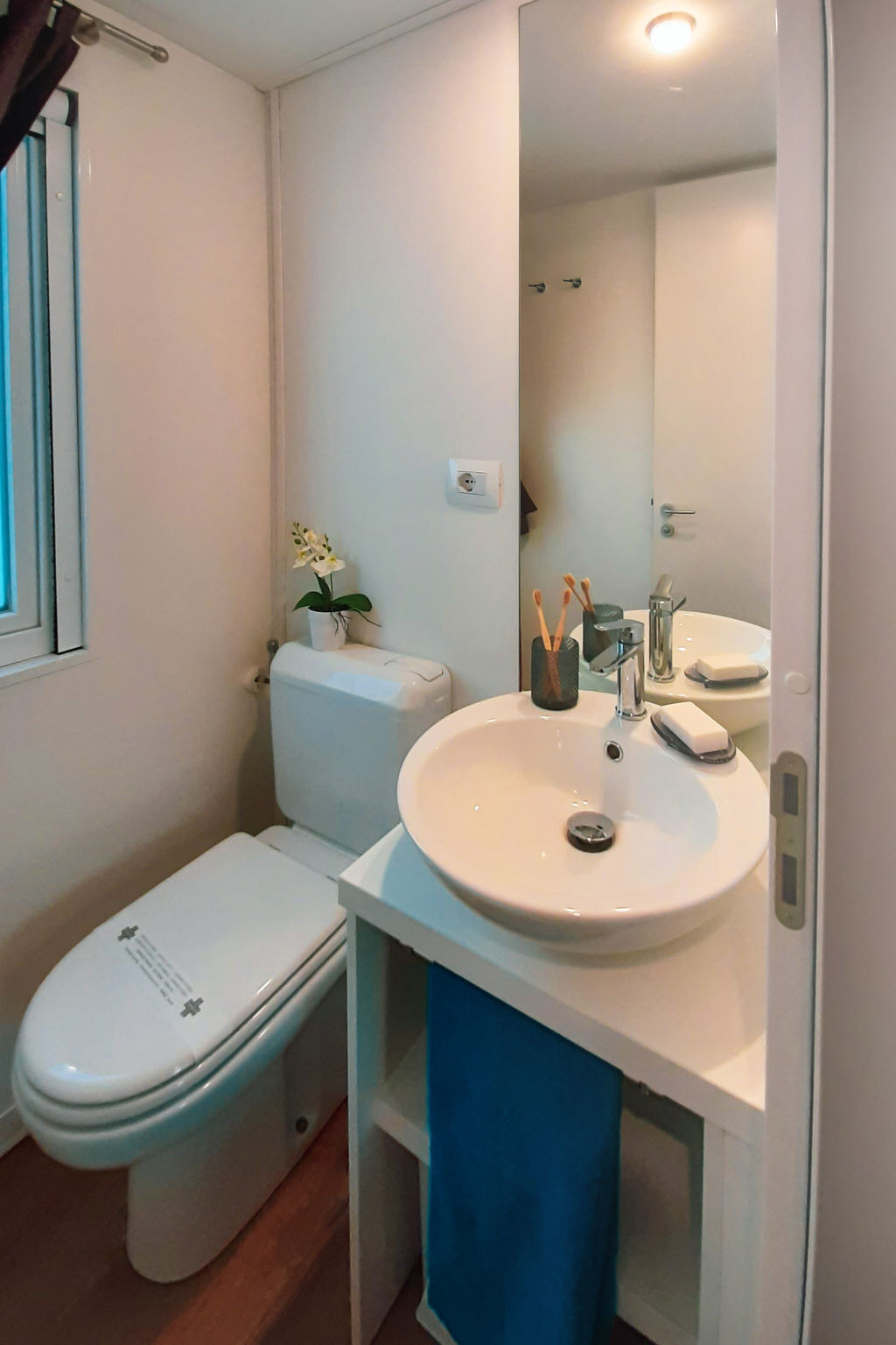 1 chambre avec 1 lit double (160 cm, longueur 195 cm), WC séparés.